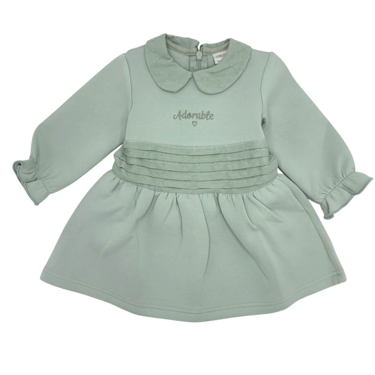 Delizioso abito in morbida felpina firmato Ellepi, ideale per le giornate più fresche. Il modello, di colore verde salvia, presenta un dolce colletto arrotondato e maniche lunghe con fiocchetti sui polsini. La parte superiore è arricchita da piccole pieghe orizzontali e dalla graziosa scritta “Adorable” ricamata sul petto. La gonna leggermente svasata assicura comodità e libertà di movimento.