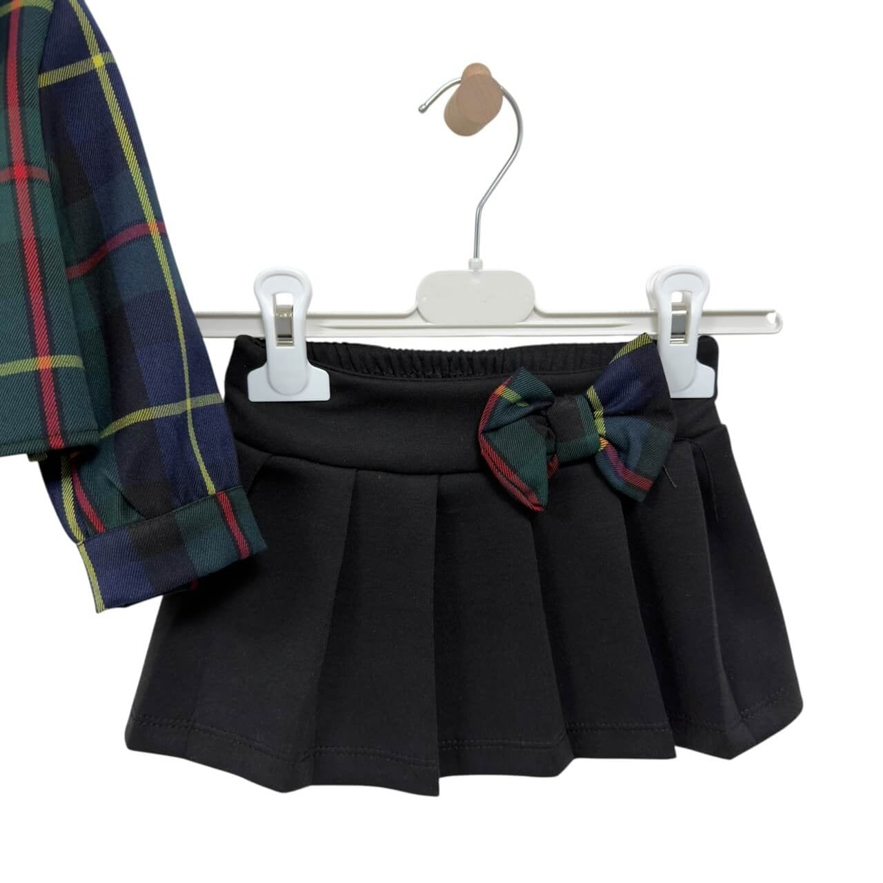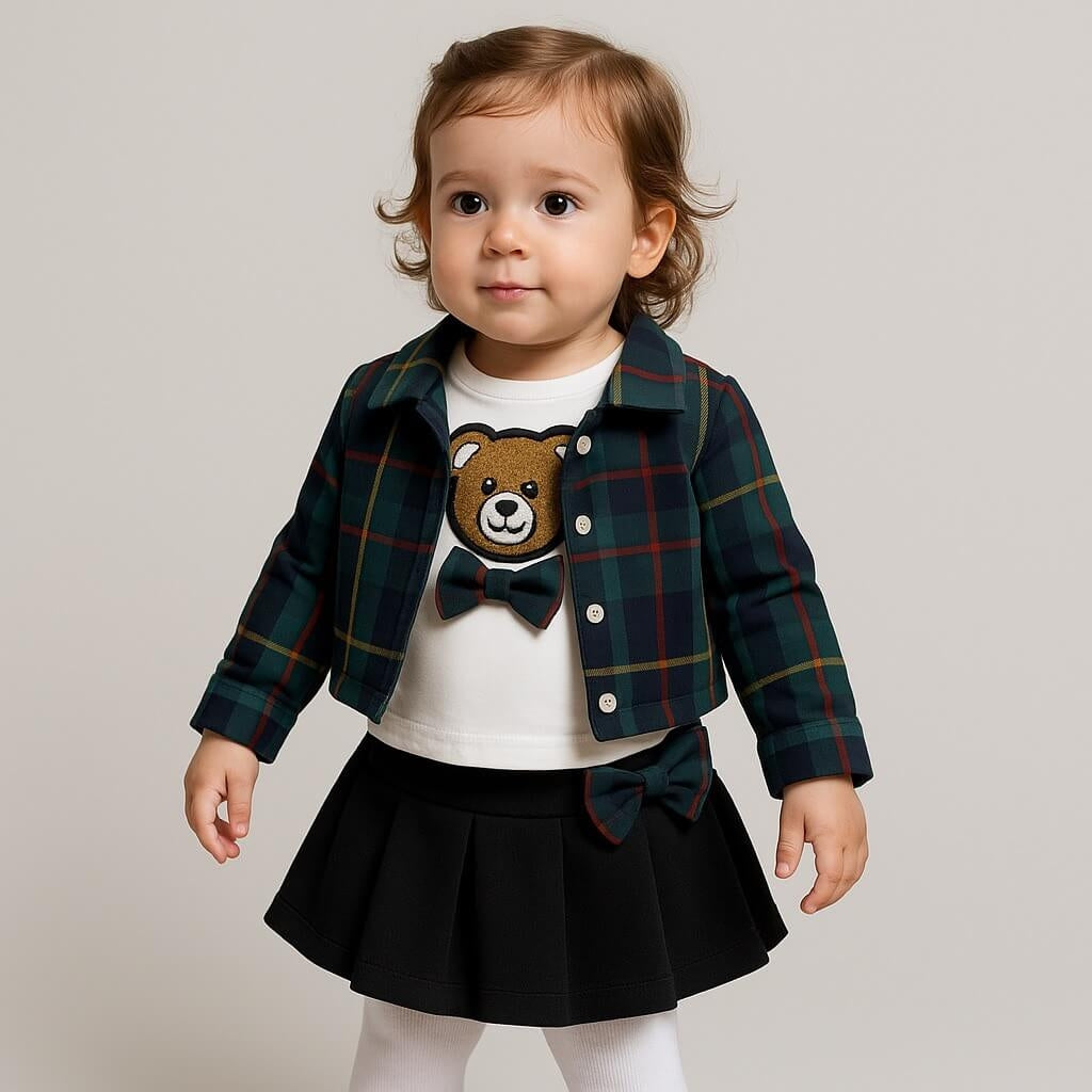 Delizioso coordinato composto da giacca con fantasia, maglia con dolce ricamo orsetto e fiocco applicato, e gonnellina abbinata. Un outfit perfetto per donare un tocco di eleganza e tenerezza alle giornate della tua bimba. Realizzato con materiali morbidi e di qualità, garantisce comfort e stile in ogni occasione.