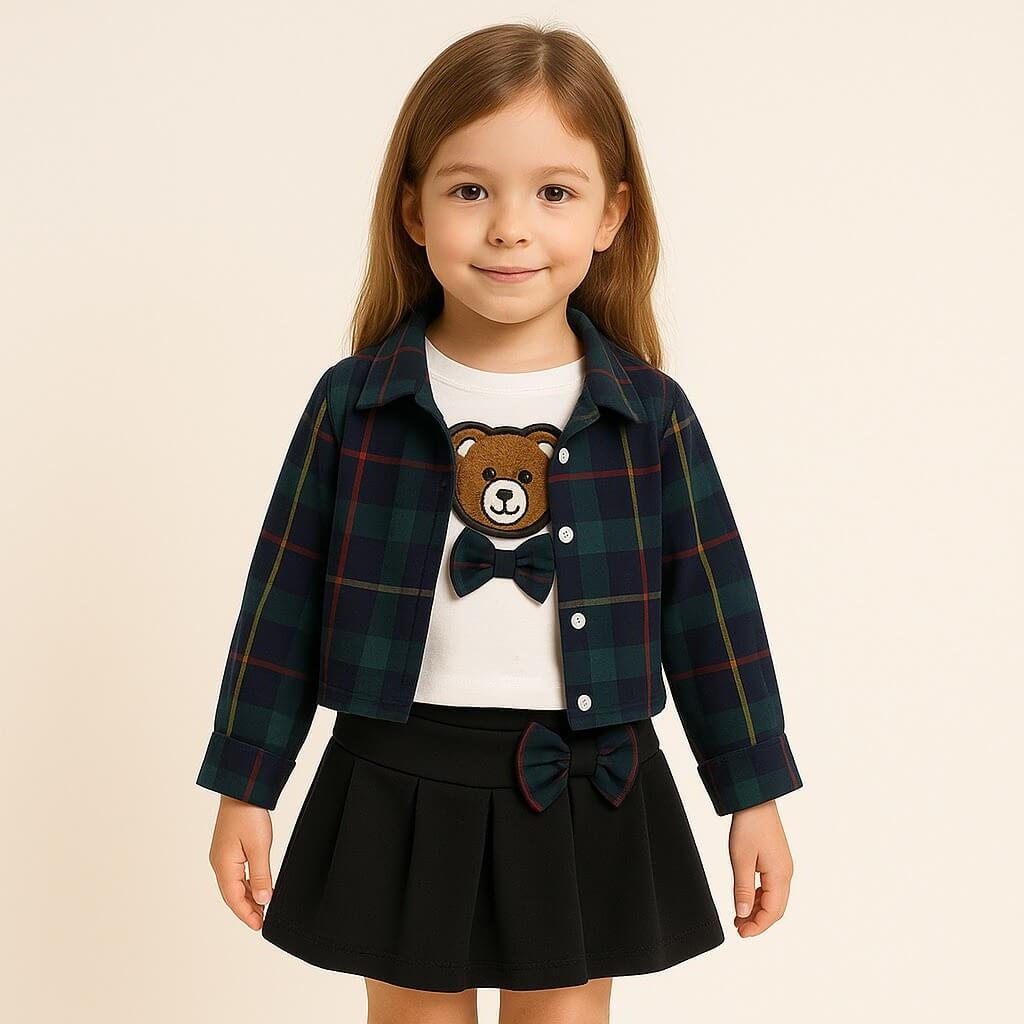 Delizioso completo da bambina composto da tre pezzi coordinati: giacca corta a maniche lunghe, t-shirt con applicazione a orsetto e graziosa gonna plissettata con fiocco abbinato.