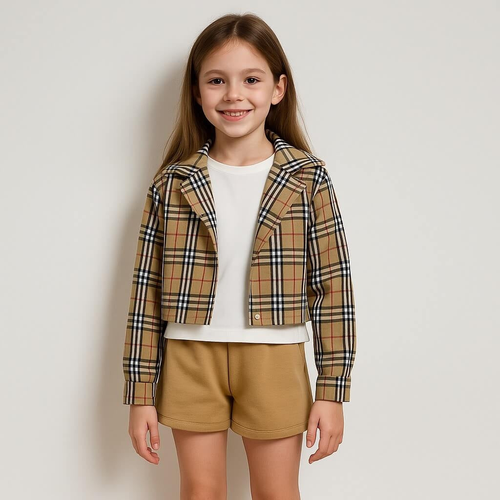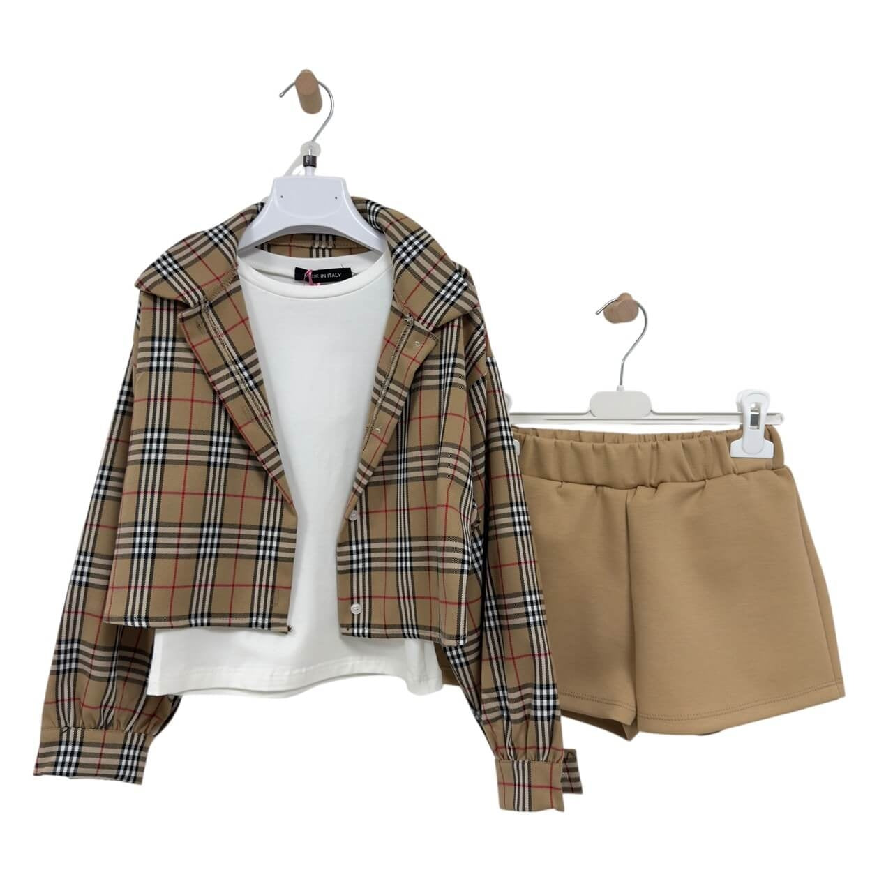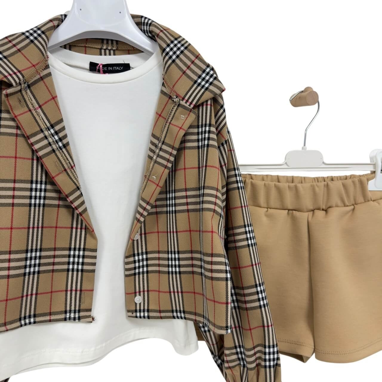 La giacca, dal taglio moderno e leggermente svasato, si abbina perfettamente alla t-shirt, che presenta una simpatica decorazione ricamata sul davanti. La gonna, con fascia elastica in vita, garantisce comfort e vestibilità ideali per ogni momento della giornata.