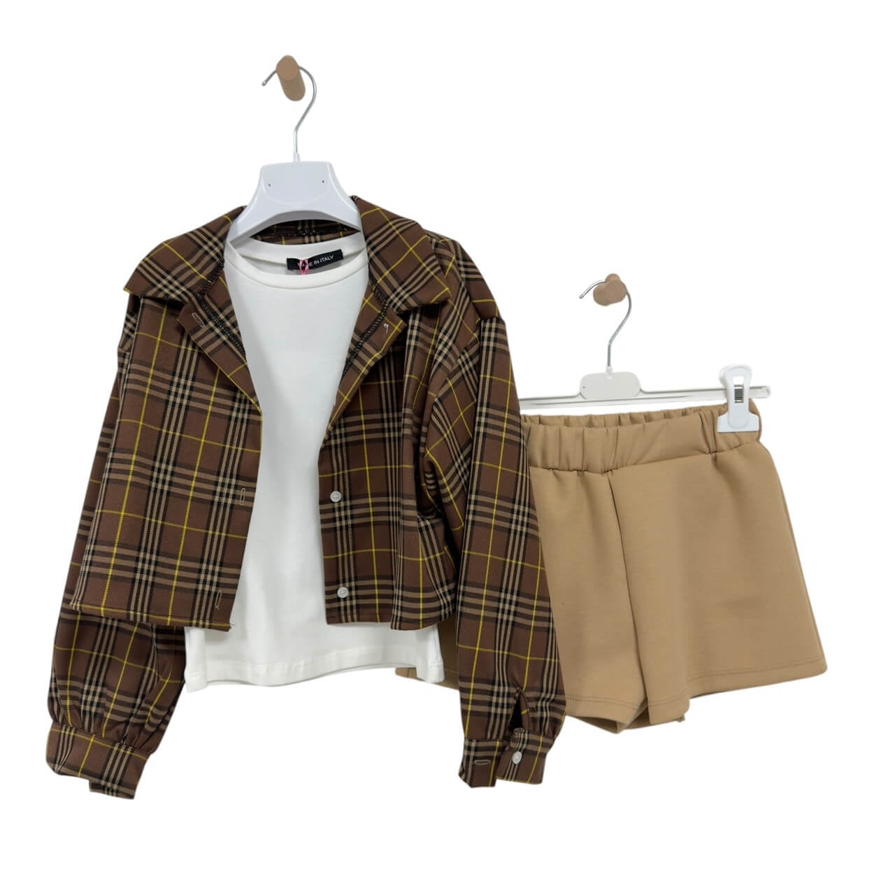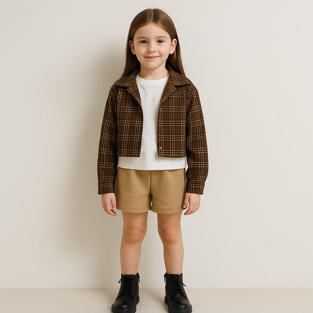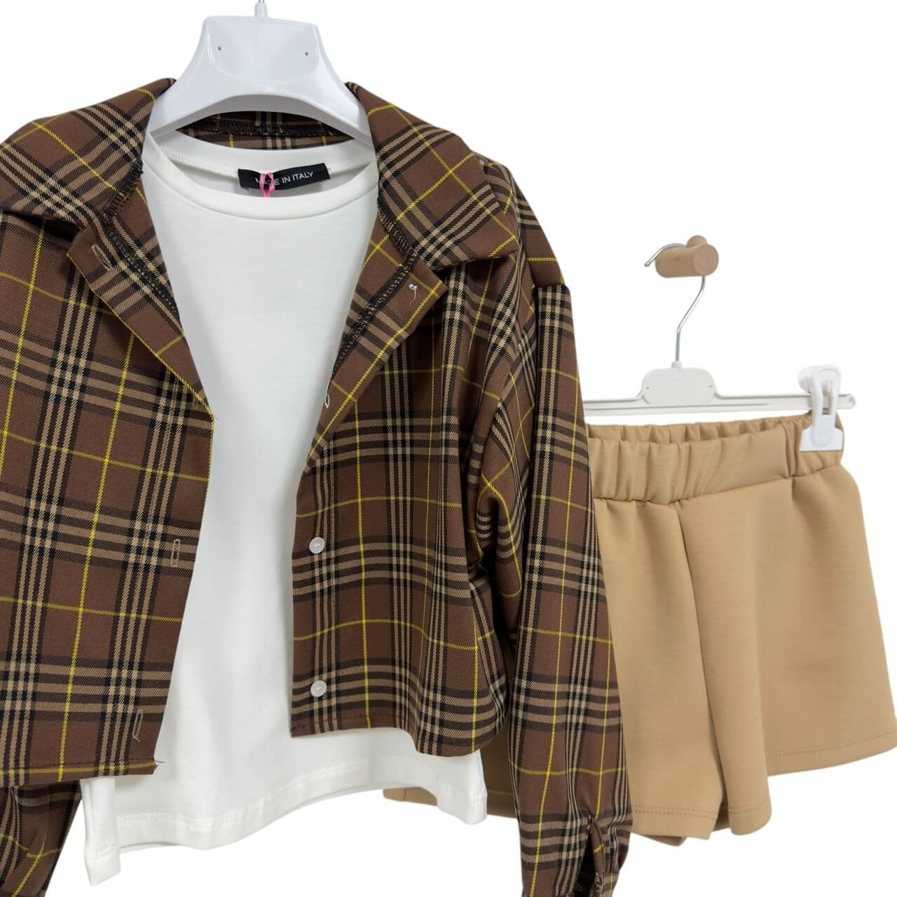 La giacca, dal taglio moderno e leggermente svasato, si abbina perfettamente alla t-shirt, che presenta una simpatica decorazione ricamata sul davanti. La gonna, con fascia elastica in vita, garantisce comfort e vestibilità ideali per ogni momento della giornata.