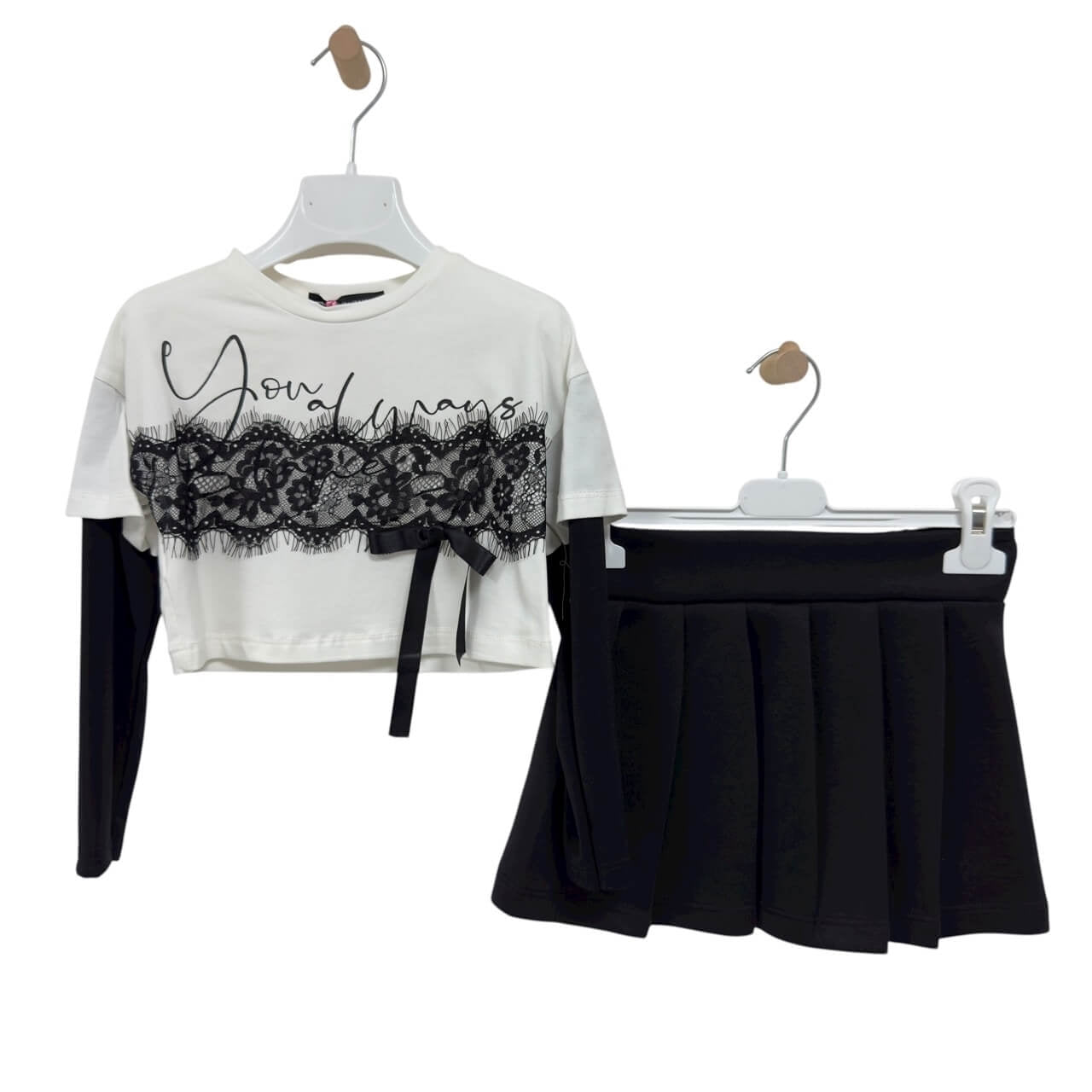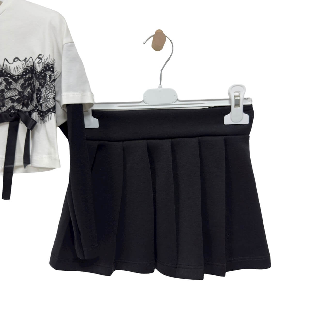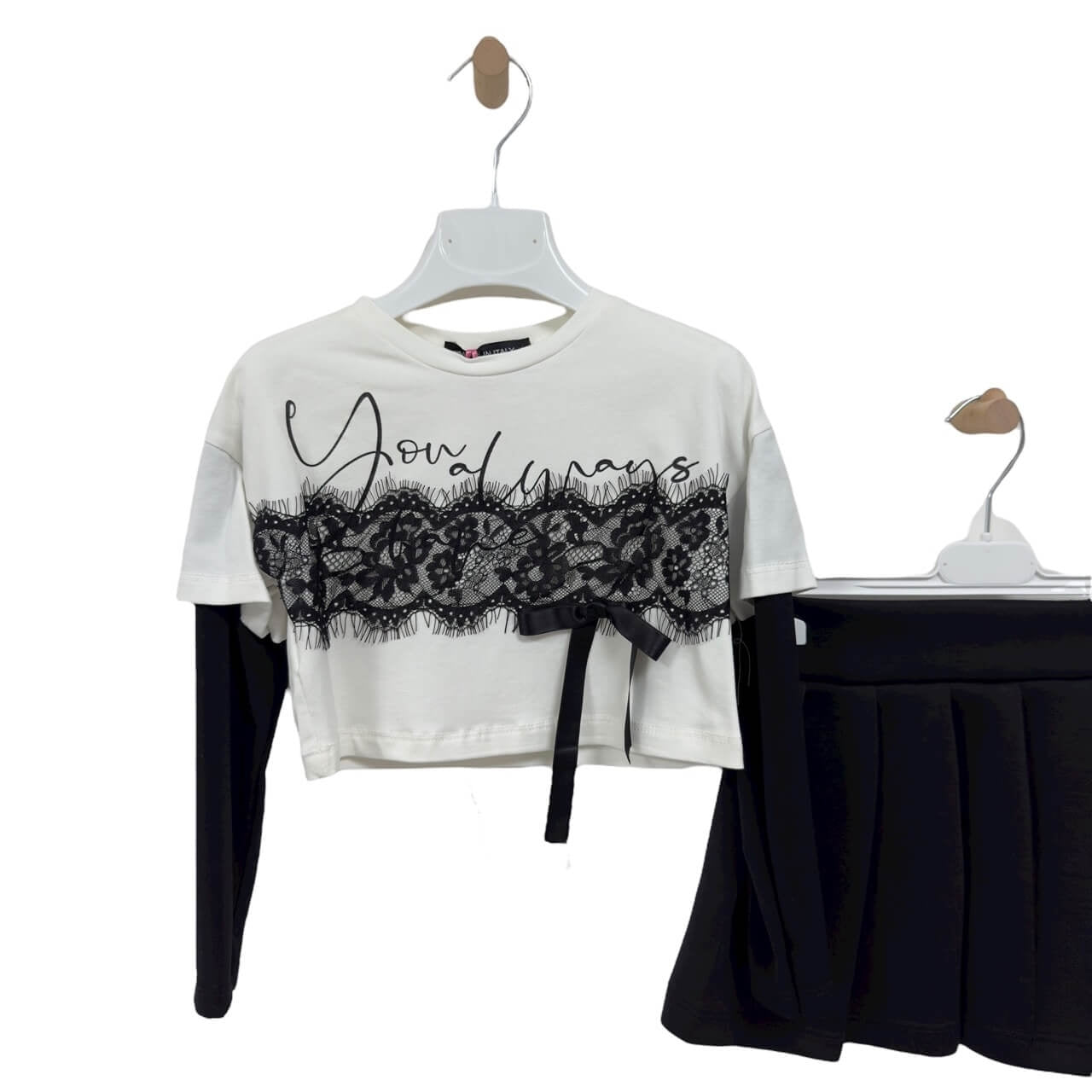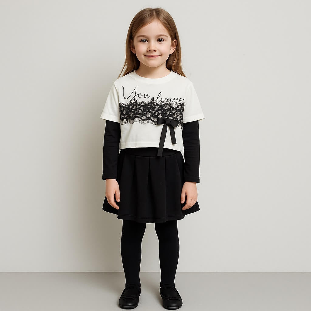 Maglia bianca con maniche nere integrate, arricchita da inserto in pizzo nero con fiocco e scritta frontale.