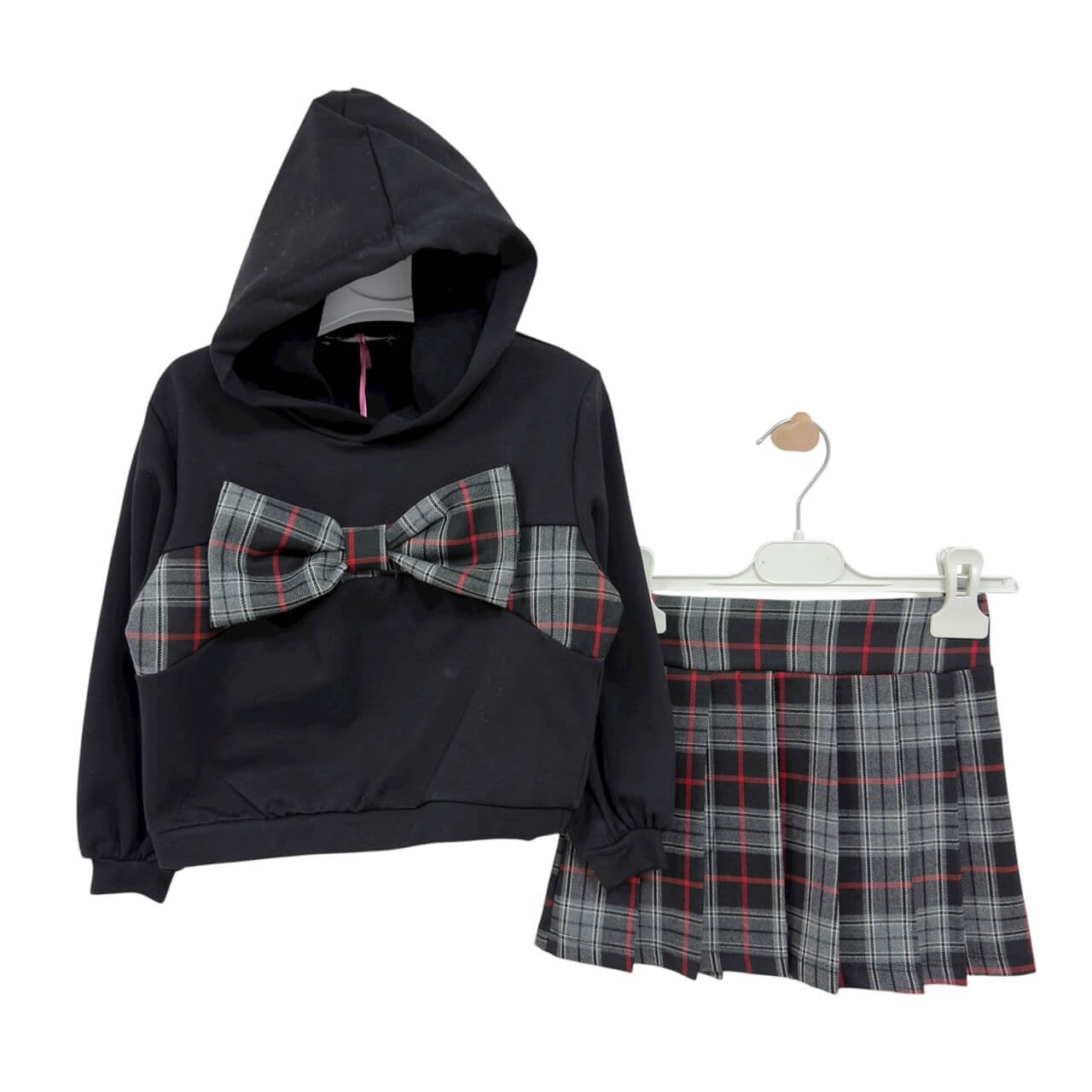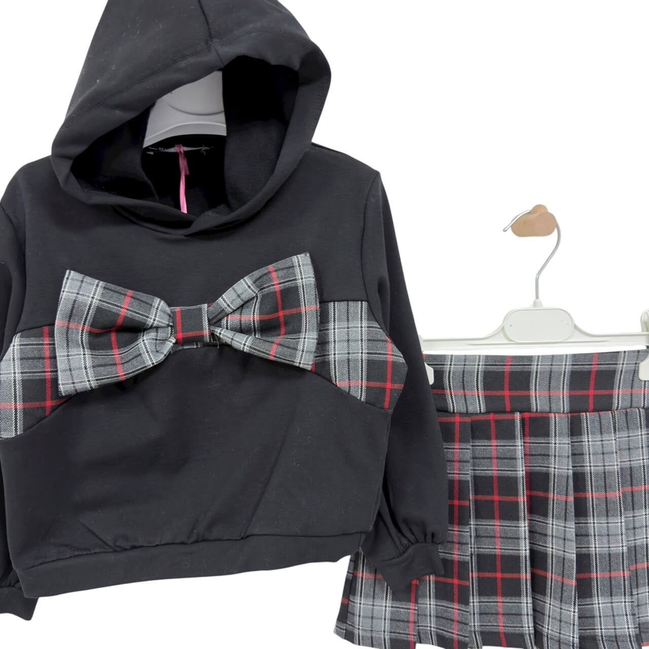 Completo elegante e confortevole firmato Nikka Nature, perfetto per la stagione invernale. Il set include una felpa bianca con cappuccio, impreziosita da un grande fiocco applicato con fantasia scozzese, e una gonna a pieghe coordinata nello stesso motivo. Realizzato con materiali morbidi e di qualità, assicura comfort e stile per ogni occasione.