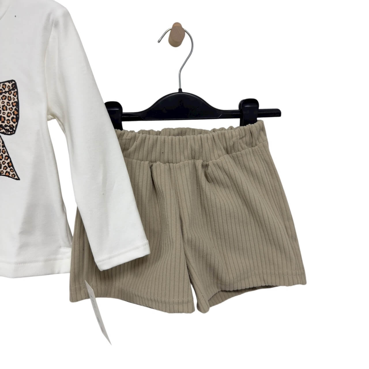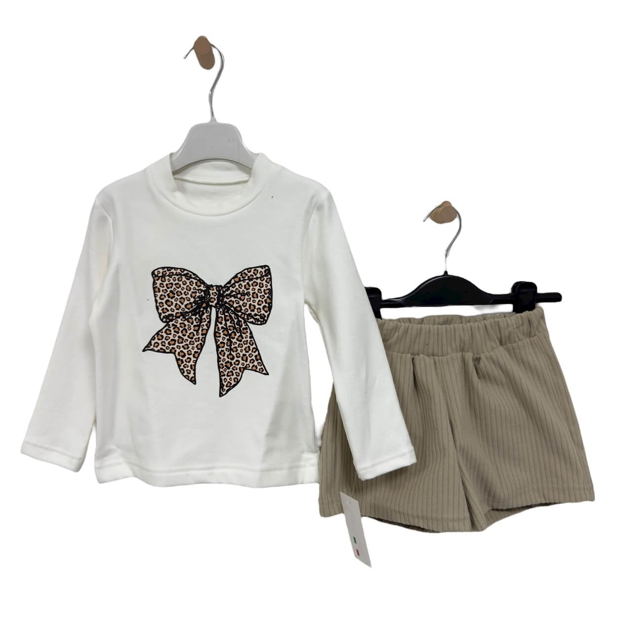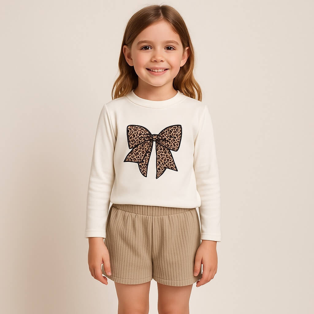 • Maglia panna a maniche lunghe con maxi fiocco stampato in fantasia animalier leopardata sul davanti.