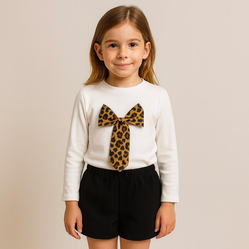 Maglia panna a maniche lunghe con maxi fiocco in fantasia animalier leopardata sul davanti.