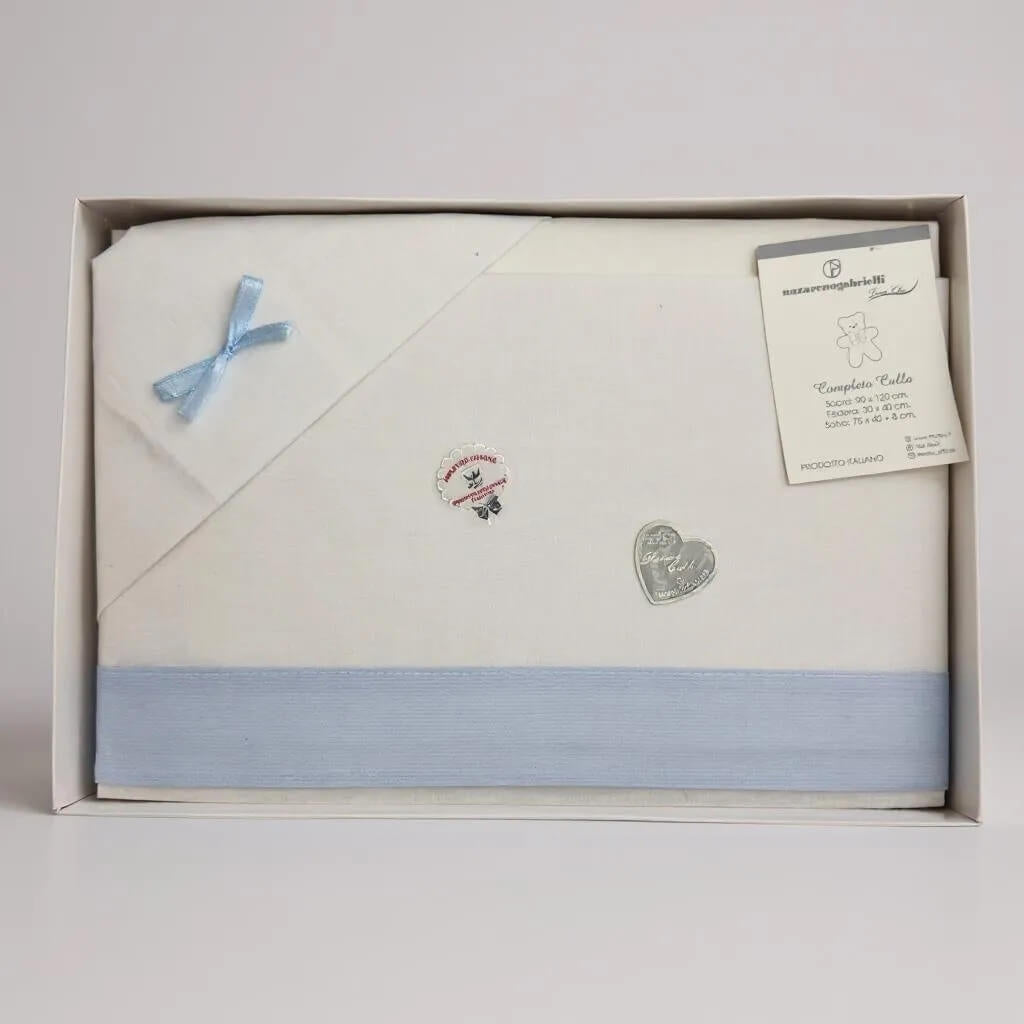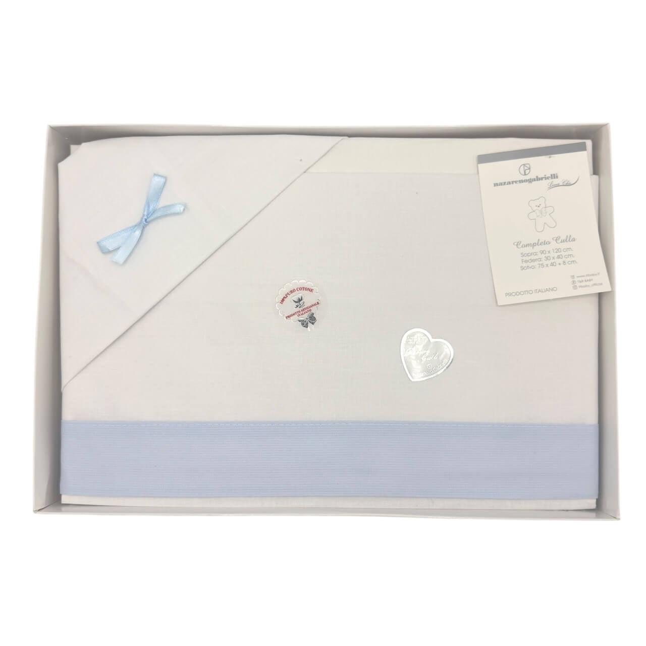 Comprende il lenzuolo di sotto (70x35 cm), il lenzuolo di sopra (80x120 cm) ed una federa (27x37 cm).