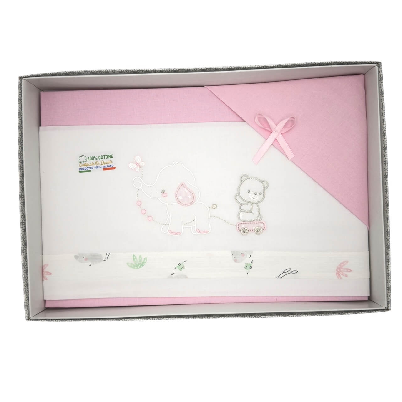 Colorato completo in puro cotone, misura adatta alla culla o alla carrozzina, ricamato con deliziosi soggetti.