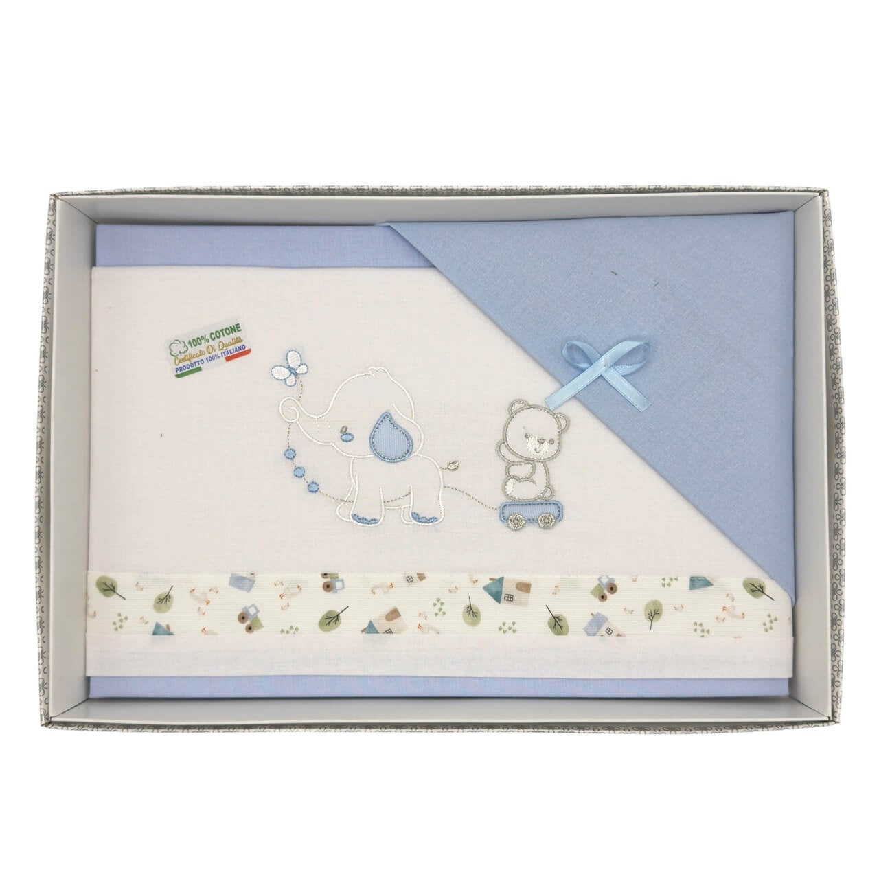 Colorato completo in puro cotone, misura adatta alla culla o alla carrozzina, ricamato con deliziosi soggetti.