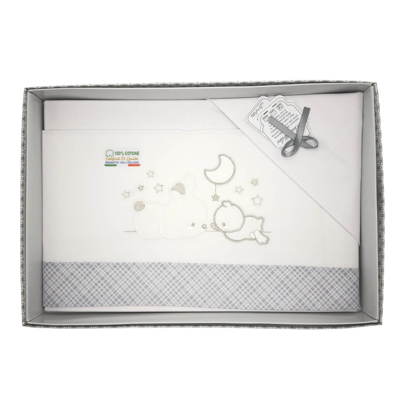 Comprende il lenzuolo di sotto (130x65x18 cm), il lenzuolo di sopra (180x120 cm) ed una federa