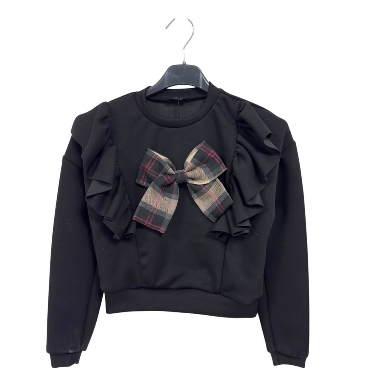 Felpa color Nero con volant sulle spalle e grande fiocco a fantasia scozzese sul petto, per un tocco romantico e moderno.