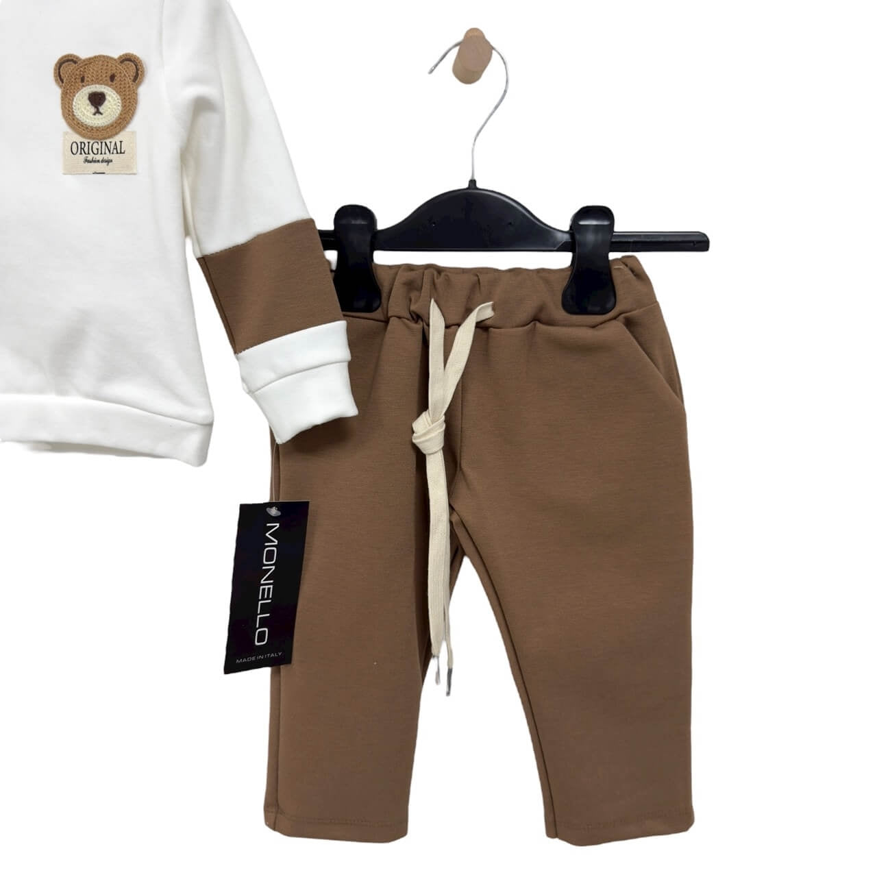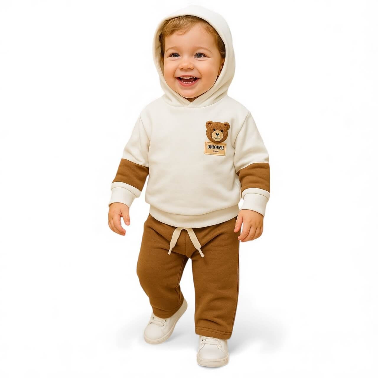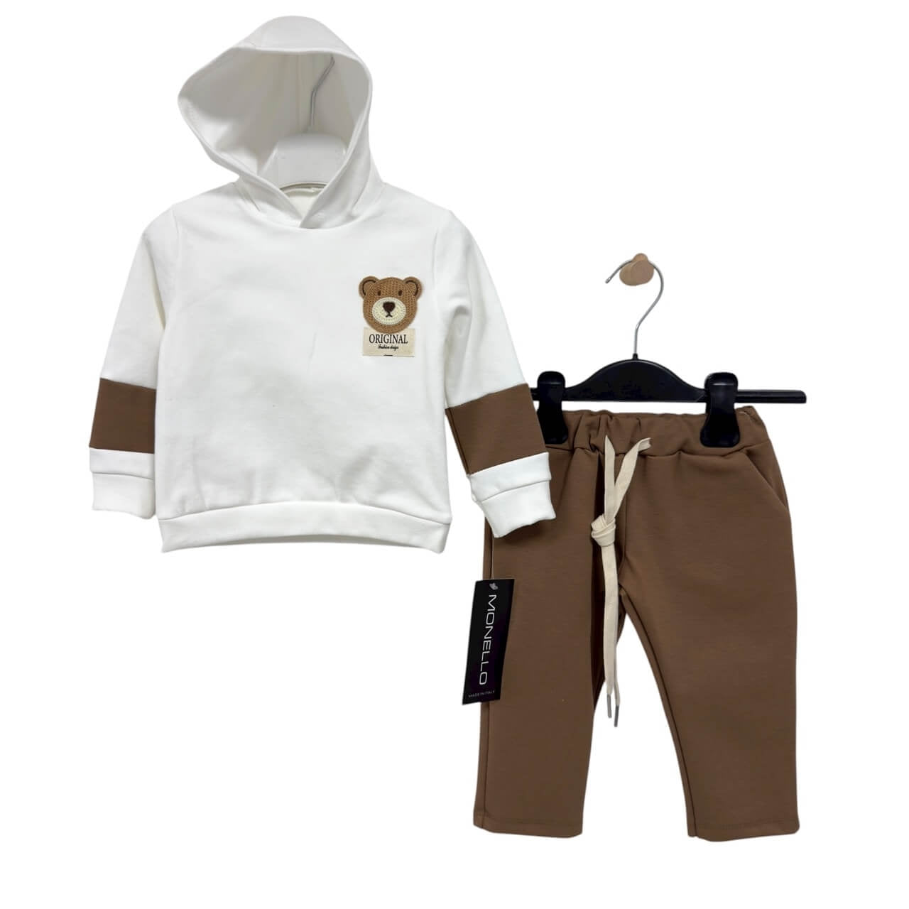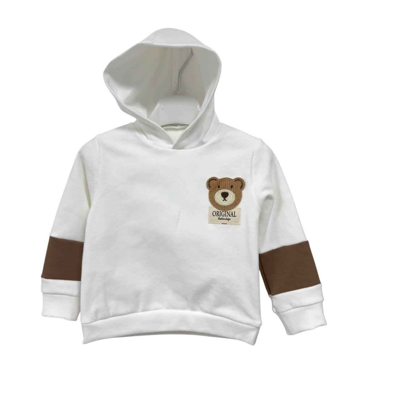• Felpa bianca con cappuccio, arricchita da patch orsetto ricamato e dettagli a contrasto color marrone sulle maniche.