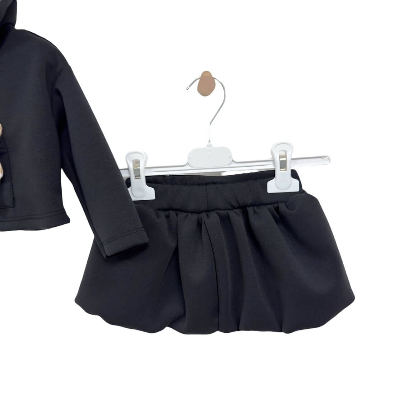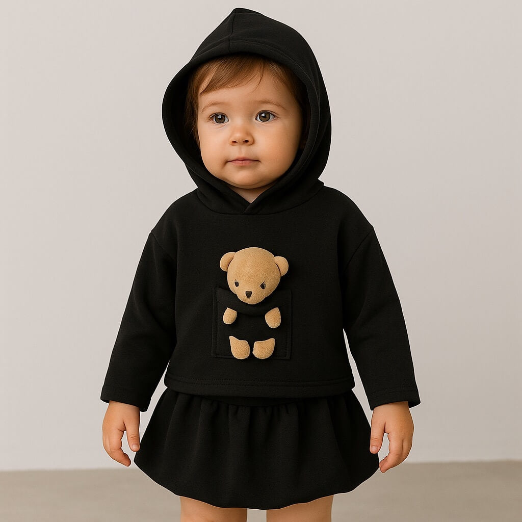 Completo elegante e comodo composto da felpa con cappuccio e gonna coordinata. La felpa è arricchita da un simpatico dettaglio applicato sul davanti, che rende il capo unico e divertente. La gonna è realizzata in tessuto scuba tecnico, che garantisce una vestibilità moderna e confortevole.