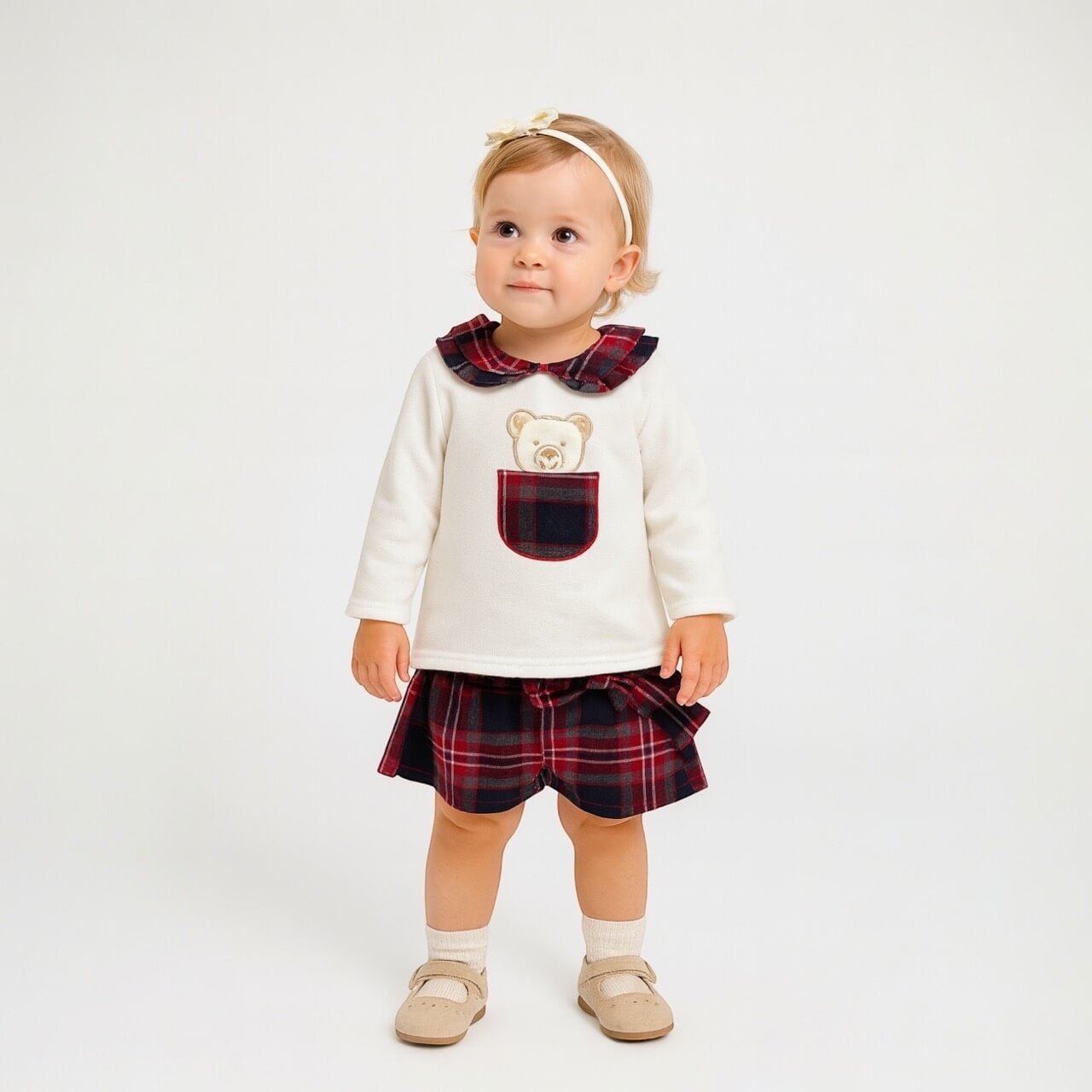 Taschino frontale in fantasia scozzese con ricamo orsetto applicato, realizzato con cura per un aspetto elegante e delicato.