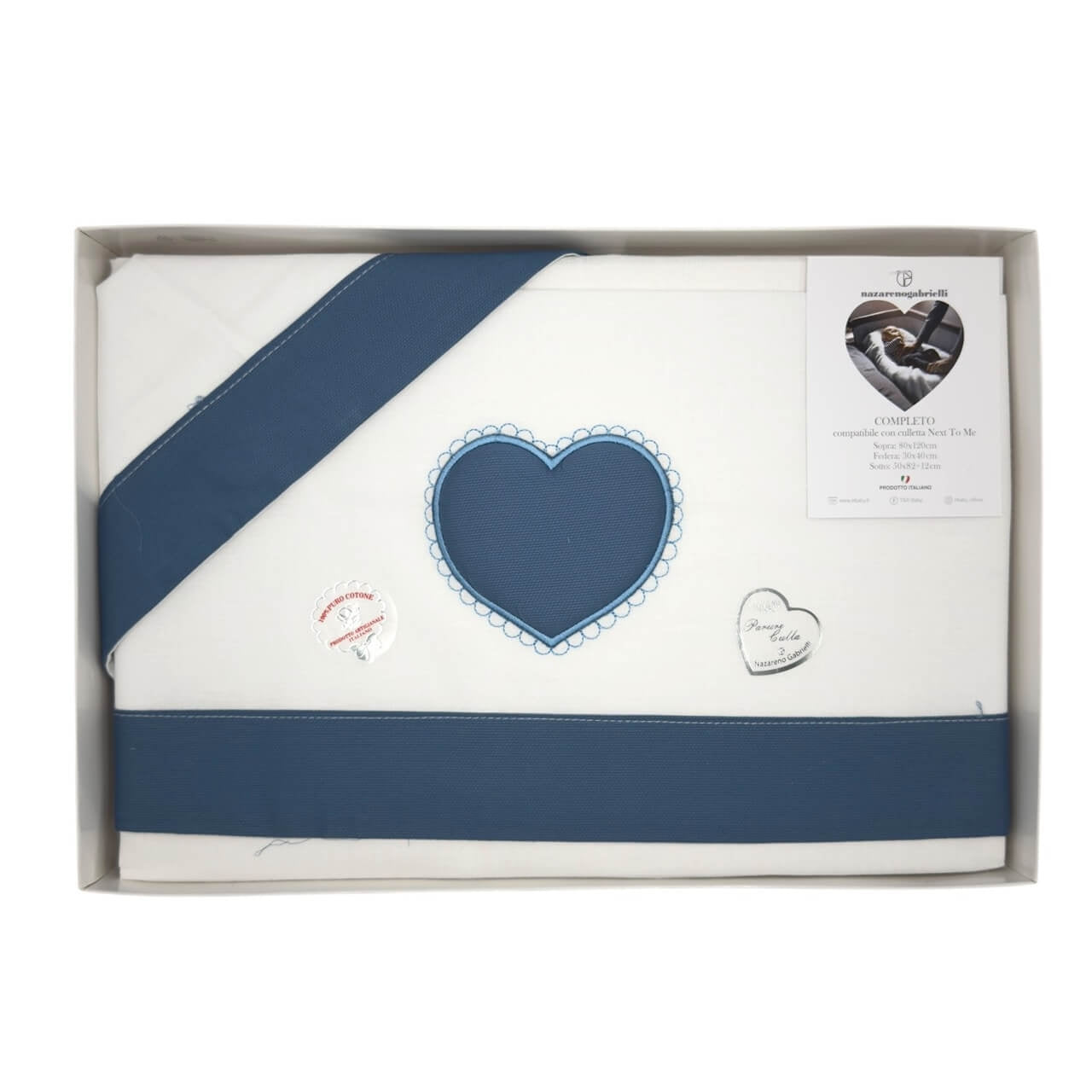 Completo lenzuola 3 pezzi in 100% puro cotone , il set lenzuola è misura maxi compatibile con le misure culla next to me. Misure: Lenzuolo sopra 80x120 cm - Sottolenzuola con angoli 50x82x12 cm - Federa cuscino 30x40 cm. Prodotto ideato, tessuto e confezionato in Italia.Il lavaggio può essere effettuato a mano o in lavatrice ad una temperatura massima che non superi i 40°C.