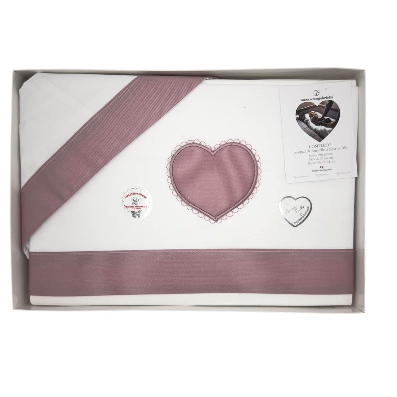 Completo lenzuola 3 pezzi in 100% puro cotone , il set lenzuola è misura maxi compatibile con le misure culla next to me. Misure: Lenzuolo sopra 80x120 cm - Sottolenzuola con angoli 50x82x12 cm - Federa cuscino 30x40 cm. Prodotto ideato, tessuto e confezionato in Italia.Il lavaggio può essere effettuato a mano o in lavatrice ad una temperatura massima che non superi i 40°C.