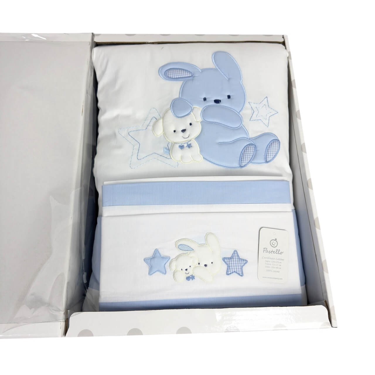 Set per culla grande composto da trapunta sfoderabile e lenzuola coordinate. Realizzato con tessuti morbidi e resistenti, offre comfort e praticità durante il riposo del bambino. La trapunta sfoderabile consente un lavaggio semplice e veloce, garantendo sempre igiene e freschezza. Il set di lenzuola completa il corredo, rendendolo funzionale e adatto all’uso quotidiano.
