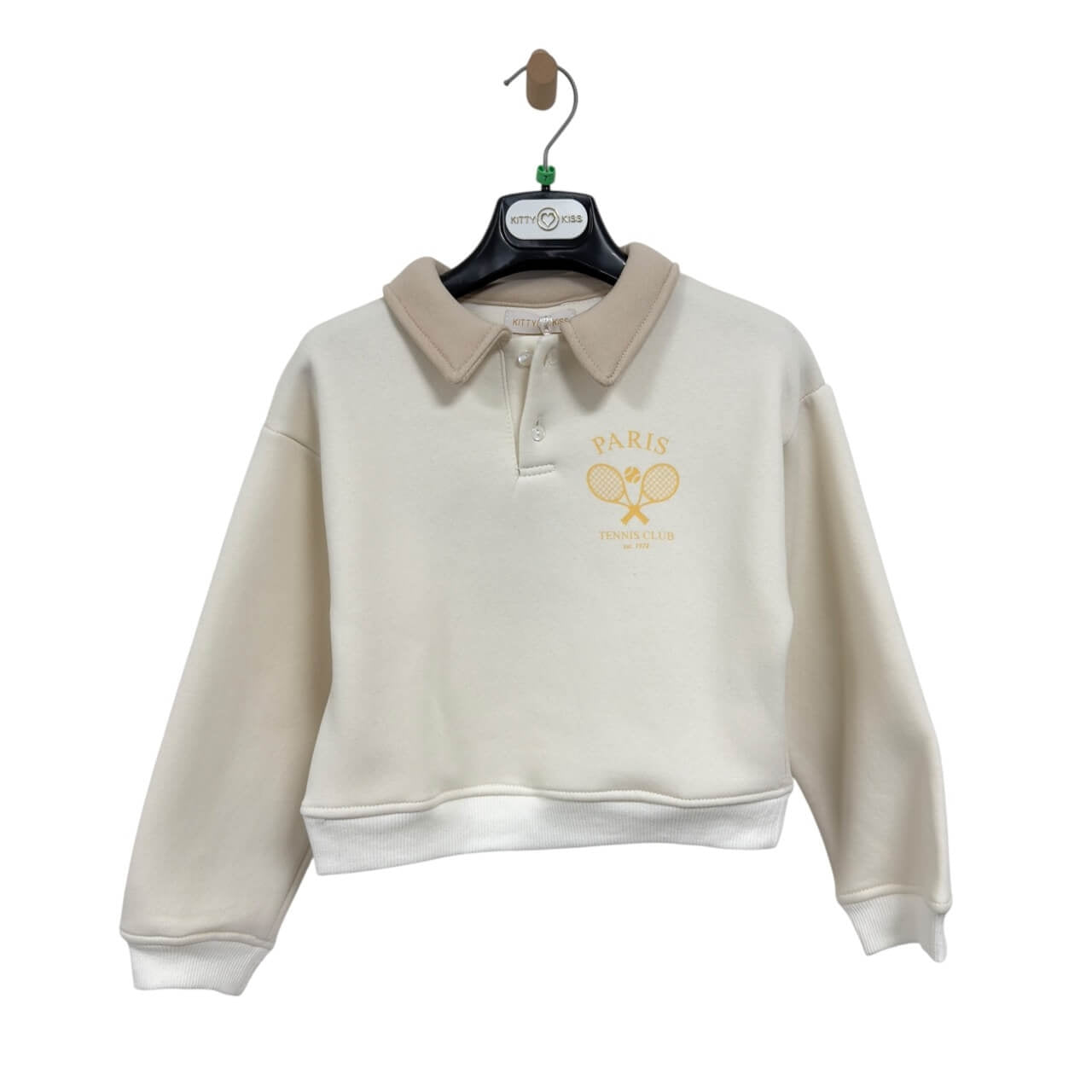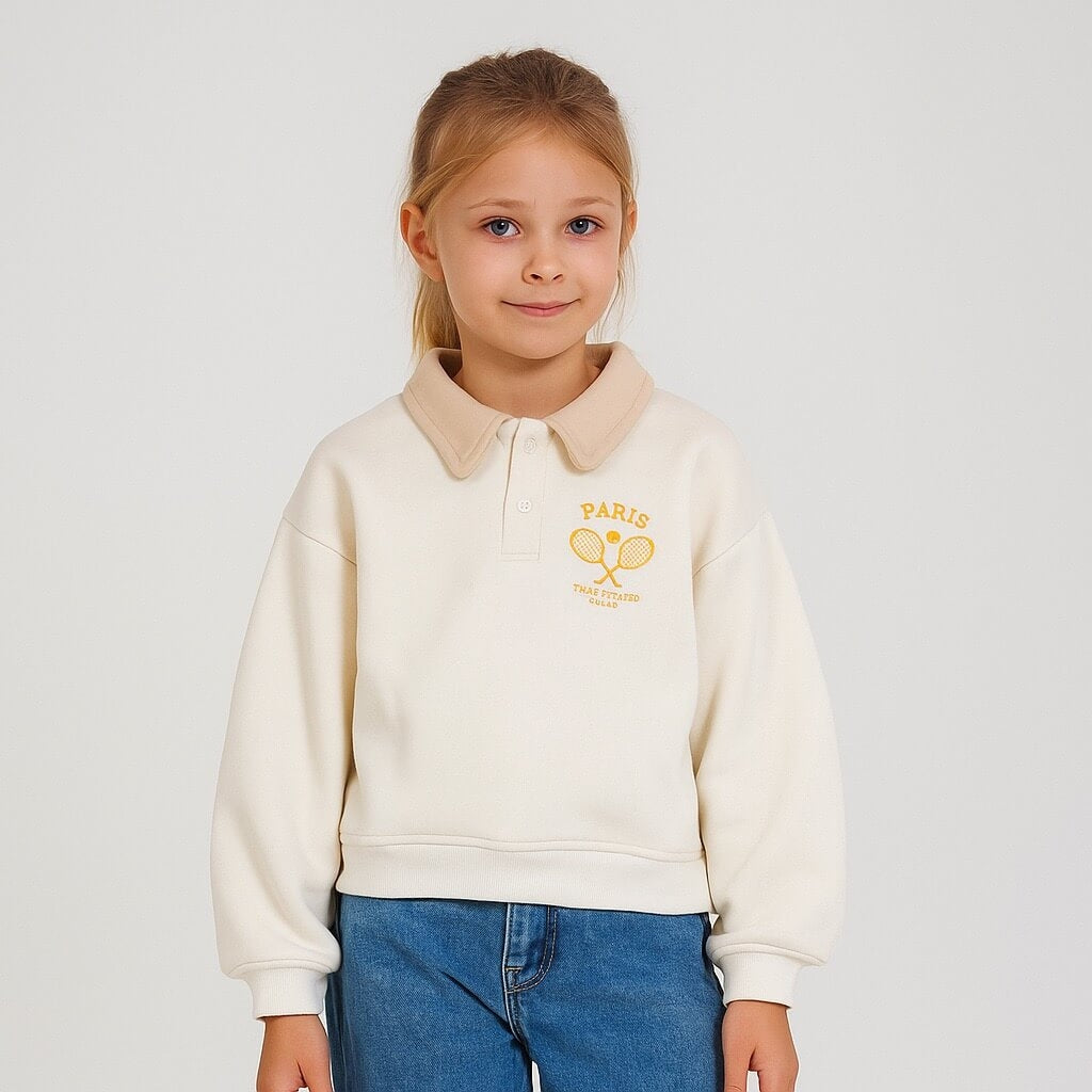Felpa da bambina con collo polo e apertura a bottoni sul davanti. La grafica frontale presenta un motivo sportivo ispirato al tennis, con scritta decorativa e racchette stilizzate. Il modello ha vestibilità comoda, polsini e fondo a costine per un maggiore comfort. Perfetta per un look casual e alla moda, ideale per l’uso quotidiano.