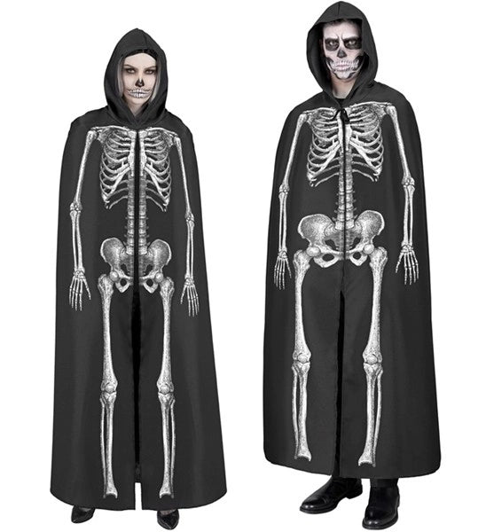 Il mantello è di colore nero con stampa frontale di uno scheletro realistico che copre l’intera lunghezza del capo. Il cappuccio integrato aggiunge un tocco misterioso e completo al travestimento.