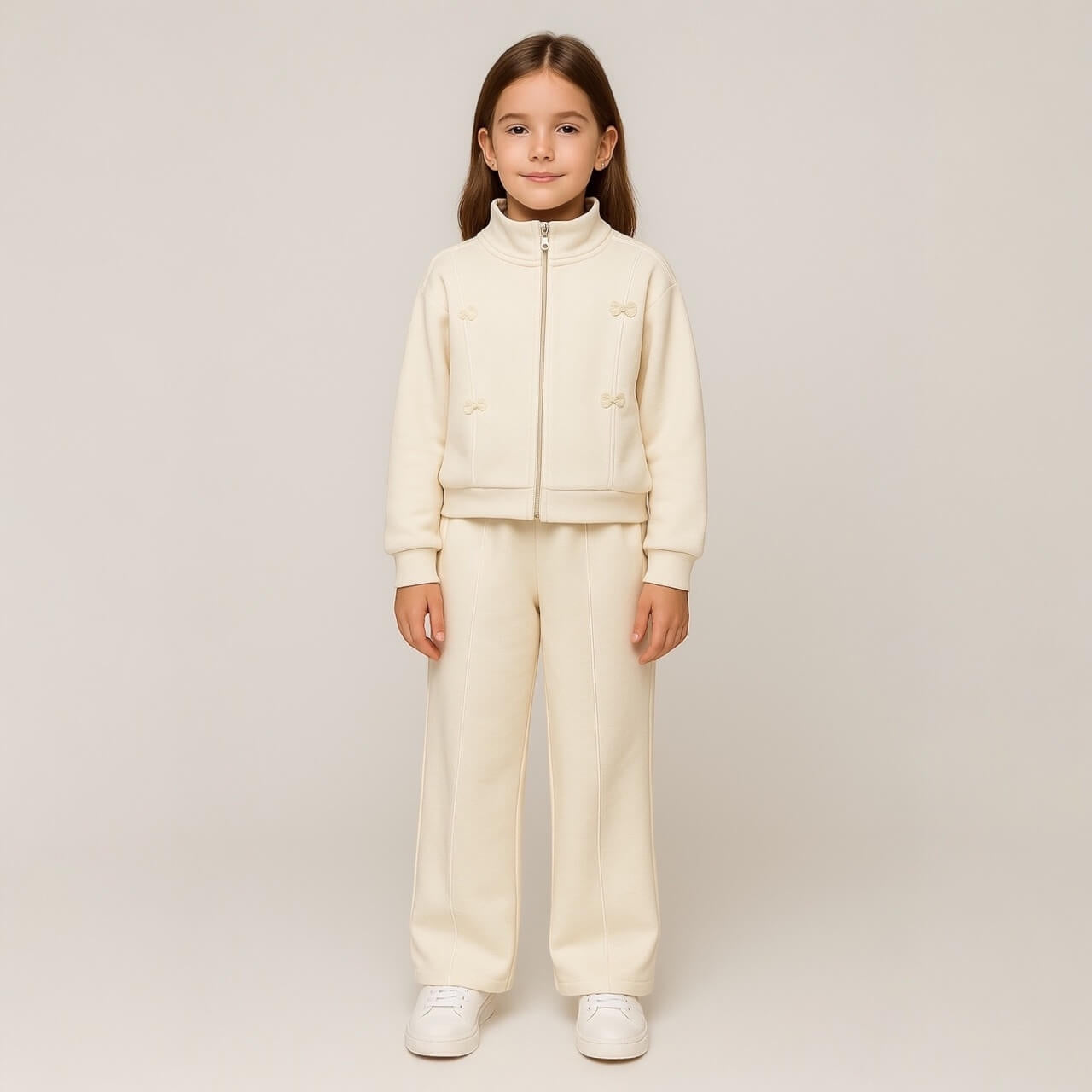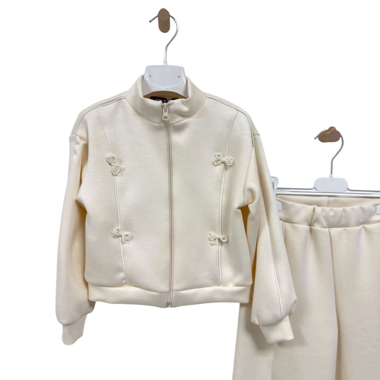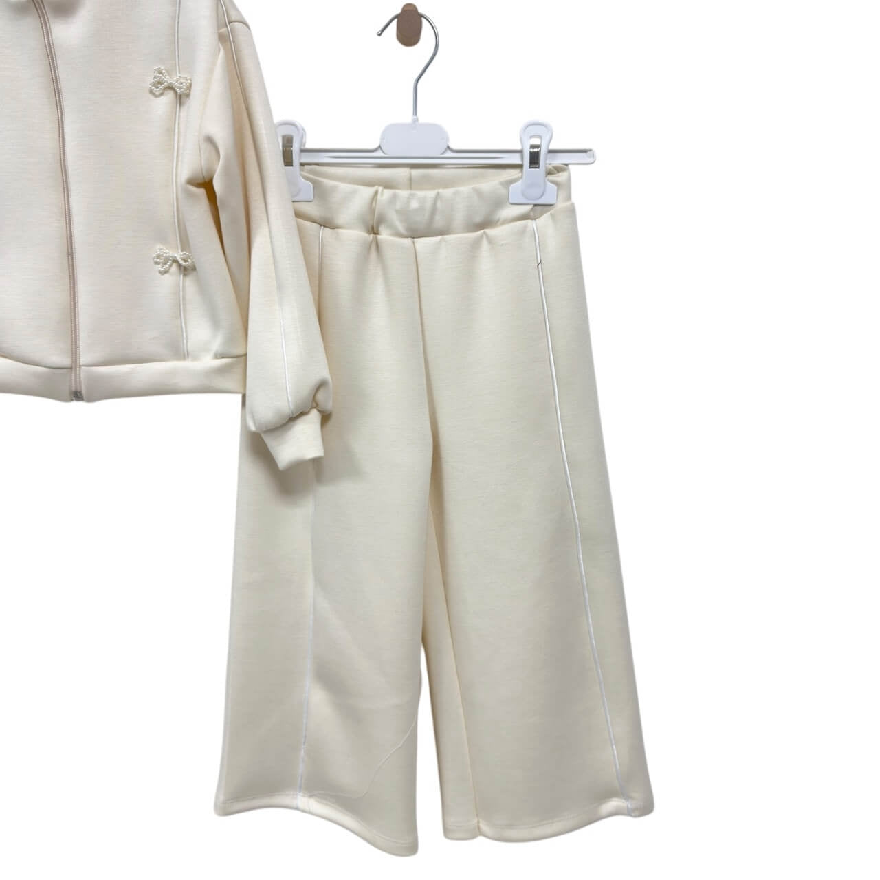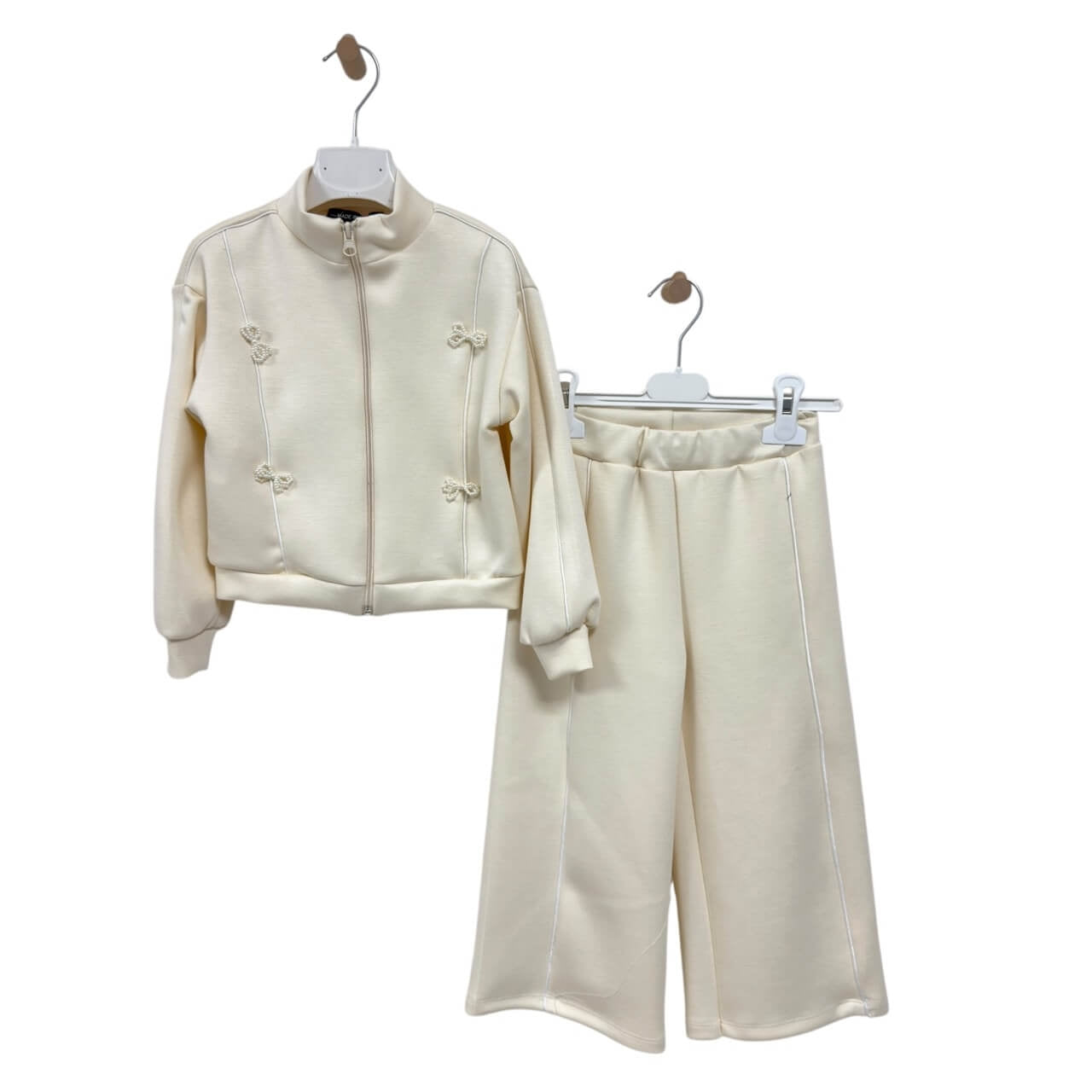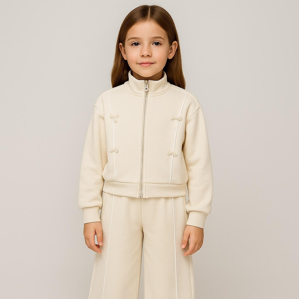 Un completo pratico e raffinato composto da giacca con zip frontale e pantalone ampio a gamba dritta. La giacca è arricchita da eleganti dettagli con fiocchetti applicati e profili a contrasto, mentre il pantalone presenta la stessa linea decorativa per un look coordinato e moderno. Realizzata in tessuti morbidi e confortevoli, questa tuta è perfetta per il tempo libero e le uscite quotidiane.