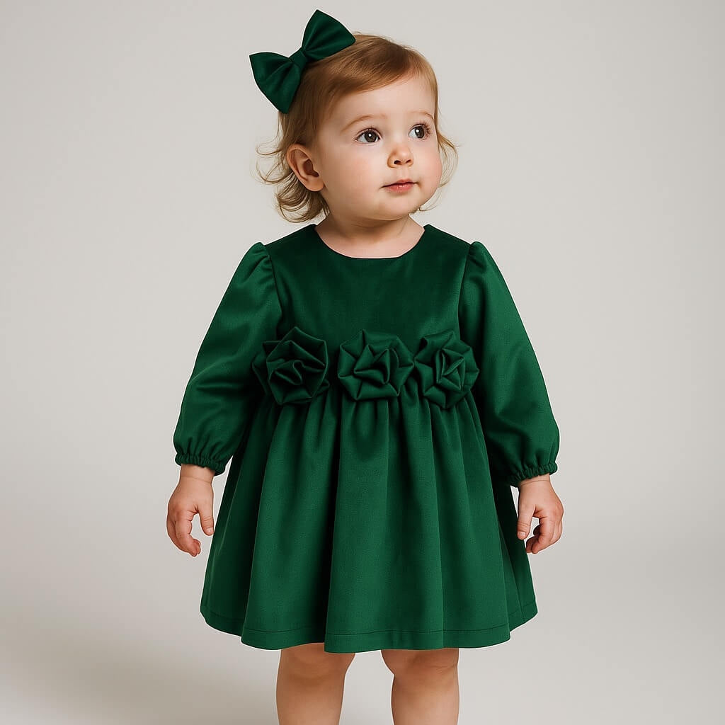 Abito da bambina in morbida ciniglietta/velluto, caratterizzato da una linea classica e raffinata. Il corpino liscio si unisce a una gonna ampia e strutturata, arricchita in vita da applicazioni floreali tridimensionali che donano un tocco romantico e ricercato. Le maniche lunghe con fondo elasticizzato assicurano comfort e praticità, mentre la chiusura posteriore rende l’indosso semplice. Perfetto per cerimonie, feste e occasioni speciali.
