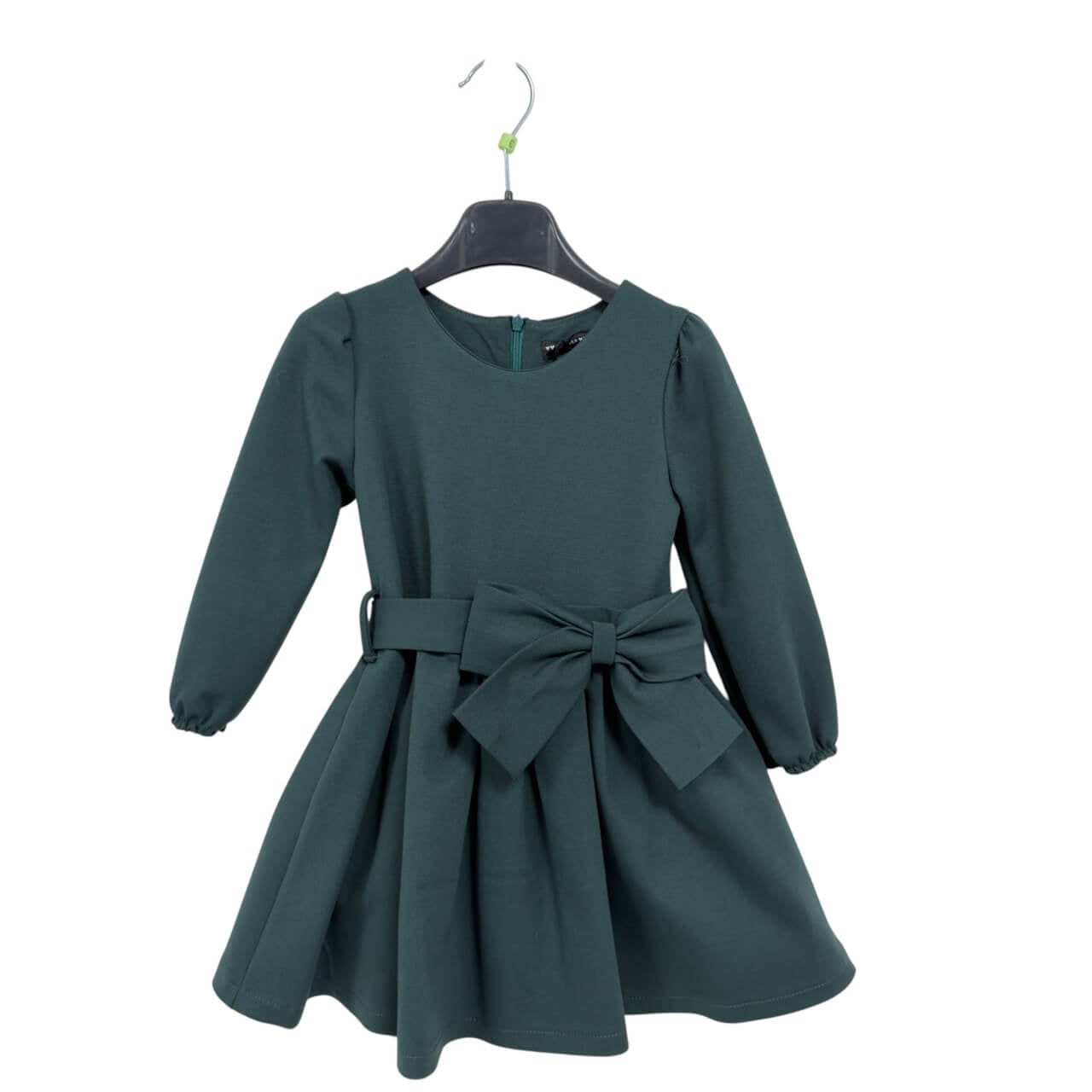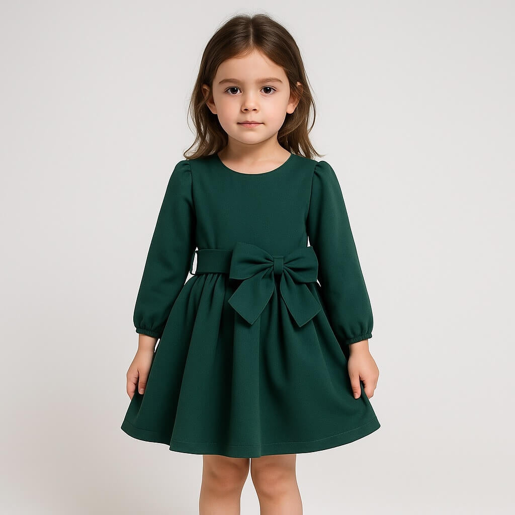 Abito elegante per bambina con linea svasata e maniche lunghe leggermente arricciate sul fondo. Il modello presenta un corpino semplice e raffinato, impreziosito da un grande fiocco applicato in vita che dona un tocco romantico e distintivo. La cintura integrata valorizza la silhouette e definisce la gonna ampia e morbida. Chiusura posteriore pratica per un indosso confortevole. Perfetto per cerimonie, feste e occasioni speciali.