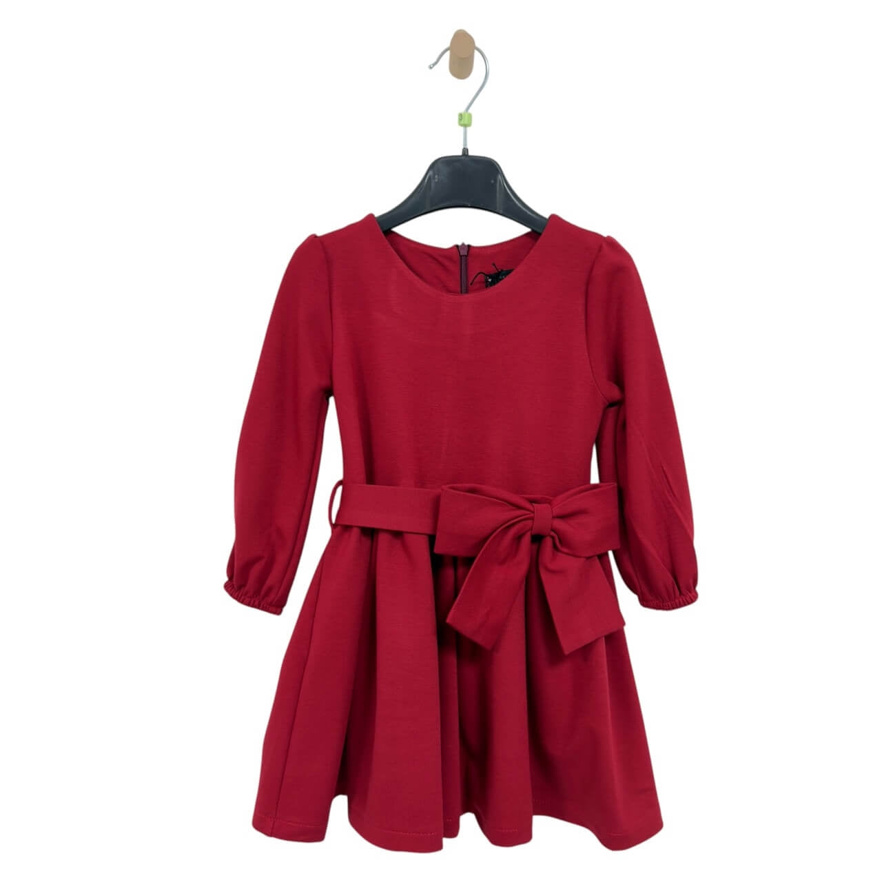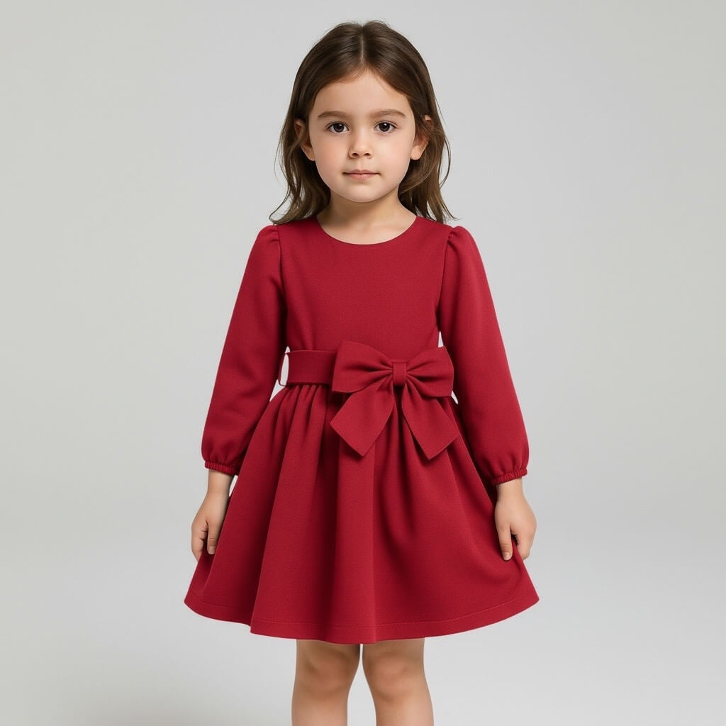 Abito elegante per bambina con linea svasata e maniche lunghe leggermente arricciate sul fondo. Il modello presenta un corpino semplice e raffinato, impreziosito da un grande fiocco applicato in vita che dona un tocco romantico e distintivo. La cintura integrata valorizza la silhouette e definisce la gonna ampia e morbida. Chiusura posteriore pratica per un indosso confortevole. Perfetto per cerimonie, feste e occasioni speciali.