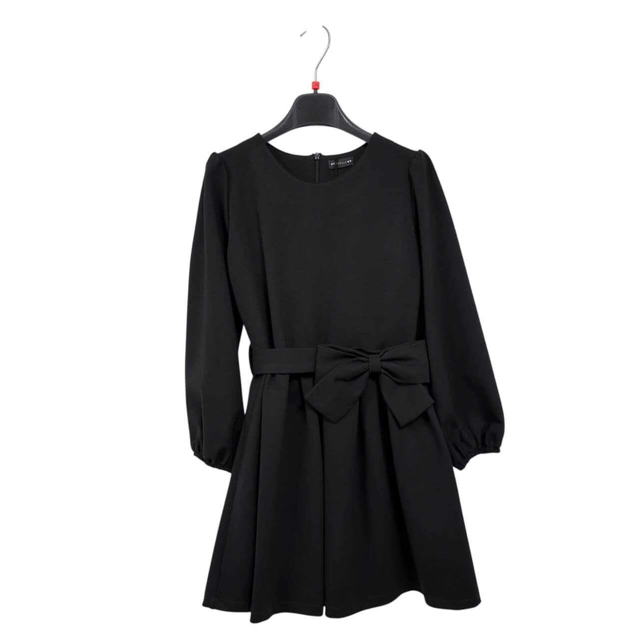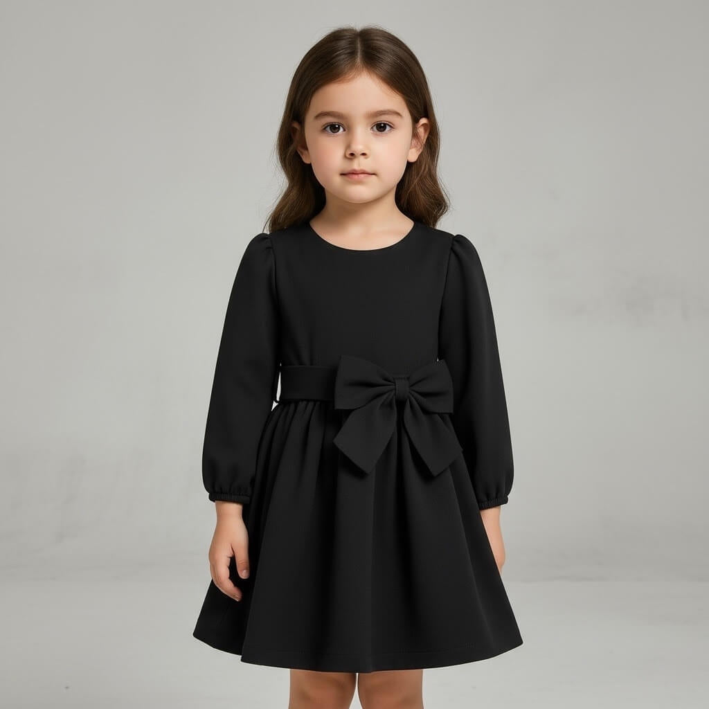 Abito elegante per bambina con linea svasata e maniche lunghe leggermente arricciate sul fondo. Il modello presenta un corpino semplice e raffinato, impreziosito da un grande fiocco applicato in vita che dona un tocco romantico e distintivo. La cintura integrata valorizza la silhouette e definisce la gonna ampia e morbida. Chiusura posteriore pratica per un indosso confortevole. Perfetto per cerimonie, feste e occasioni speciali.