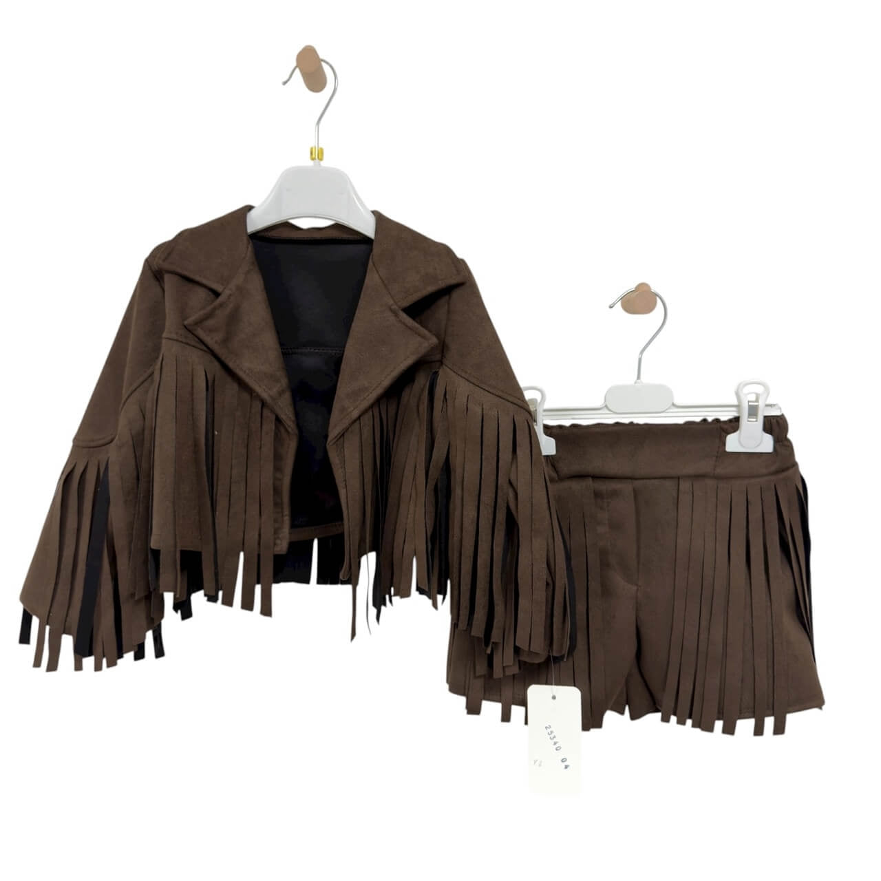 Completo bambina composto da Giacca in camoscio con frange + shorts in camoscio con frange.