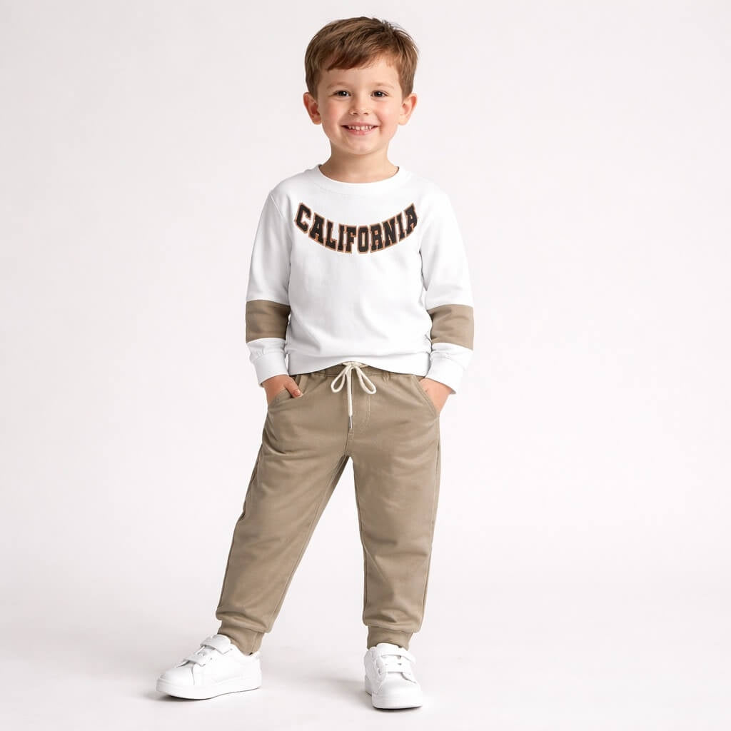 Comodo e alla moda, questo completo in cotone Made in Italy firmato Monello è pensato per garantire libertà di movimento e comfort durante tutta la giornata. La felpa a maniche lunghe con Stampa applicato e il pantalone a tuta offrono praticità e un look moderno, ideale per la scuola, il tempo libero e le giornate più fresche.