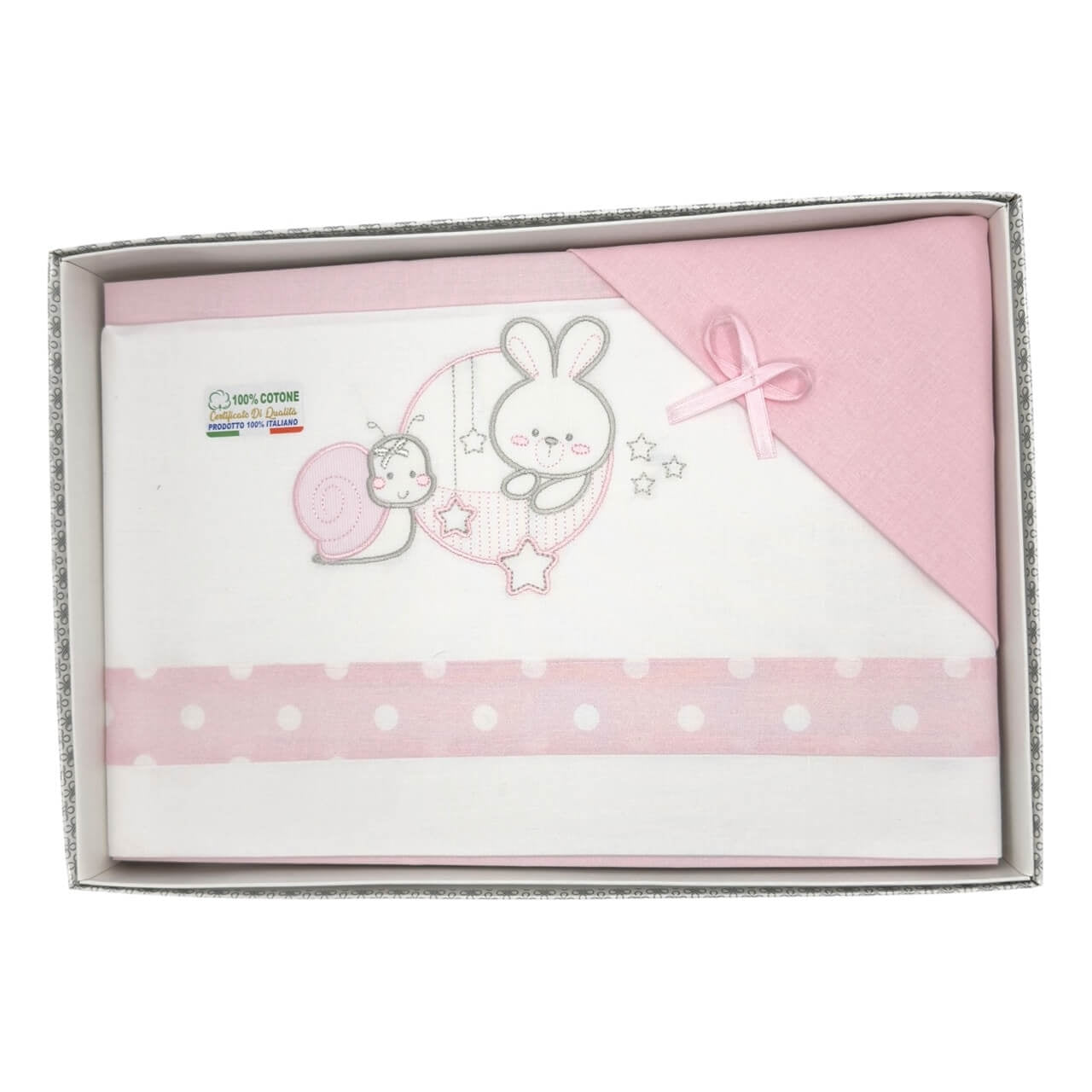 Colorato completo in puro cotone, misura adatta alla culla o alla carrozzina, ricamato con deliziosi soggetti.
