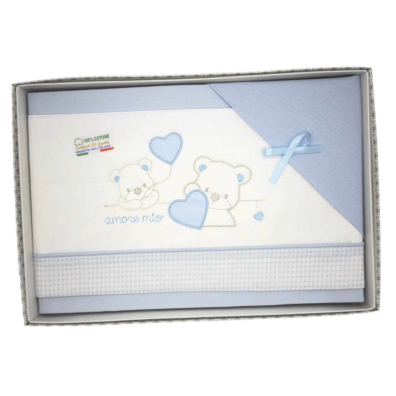 Colorato completo in puro cotone, misura adatta alla culla o alla carrozzina, ricamato con deliziosi soggetti.