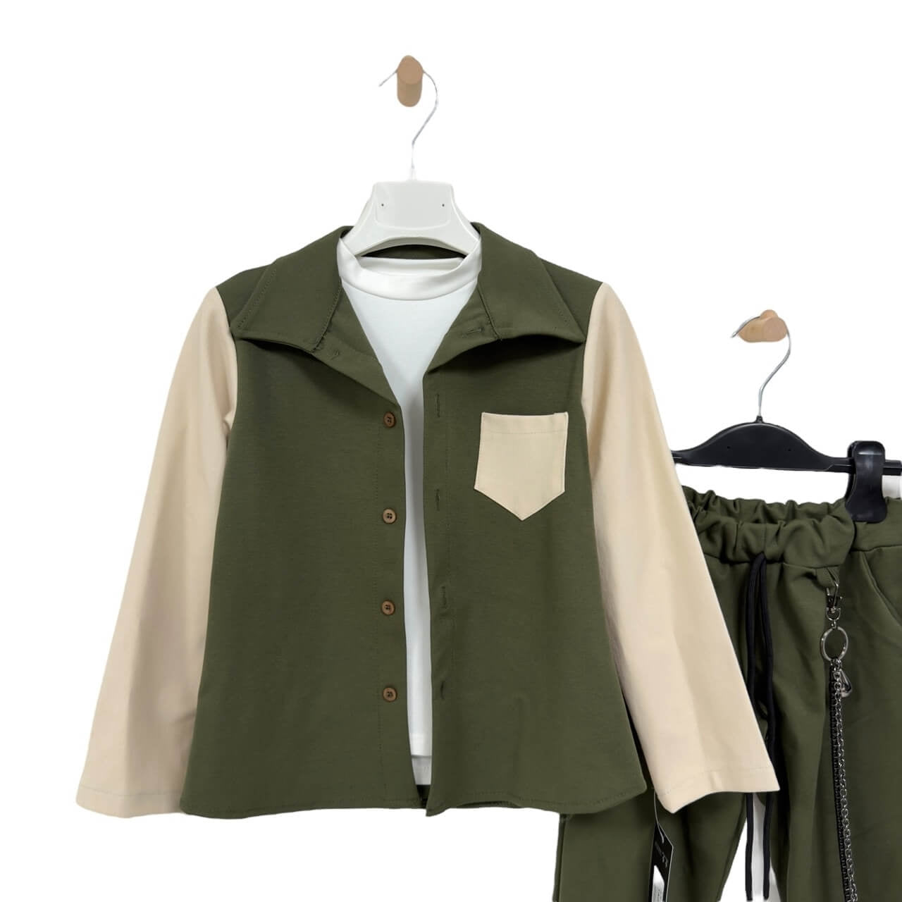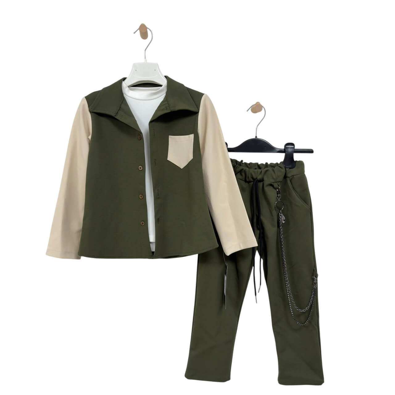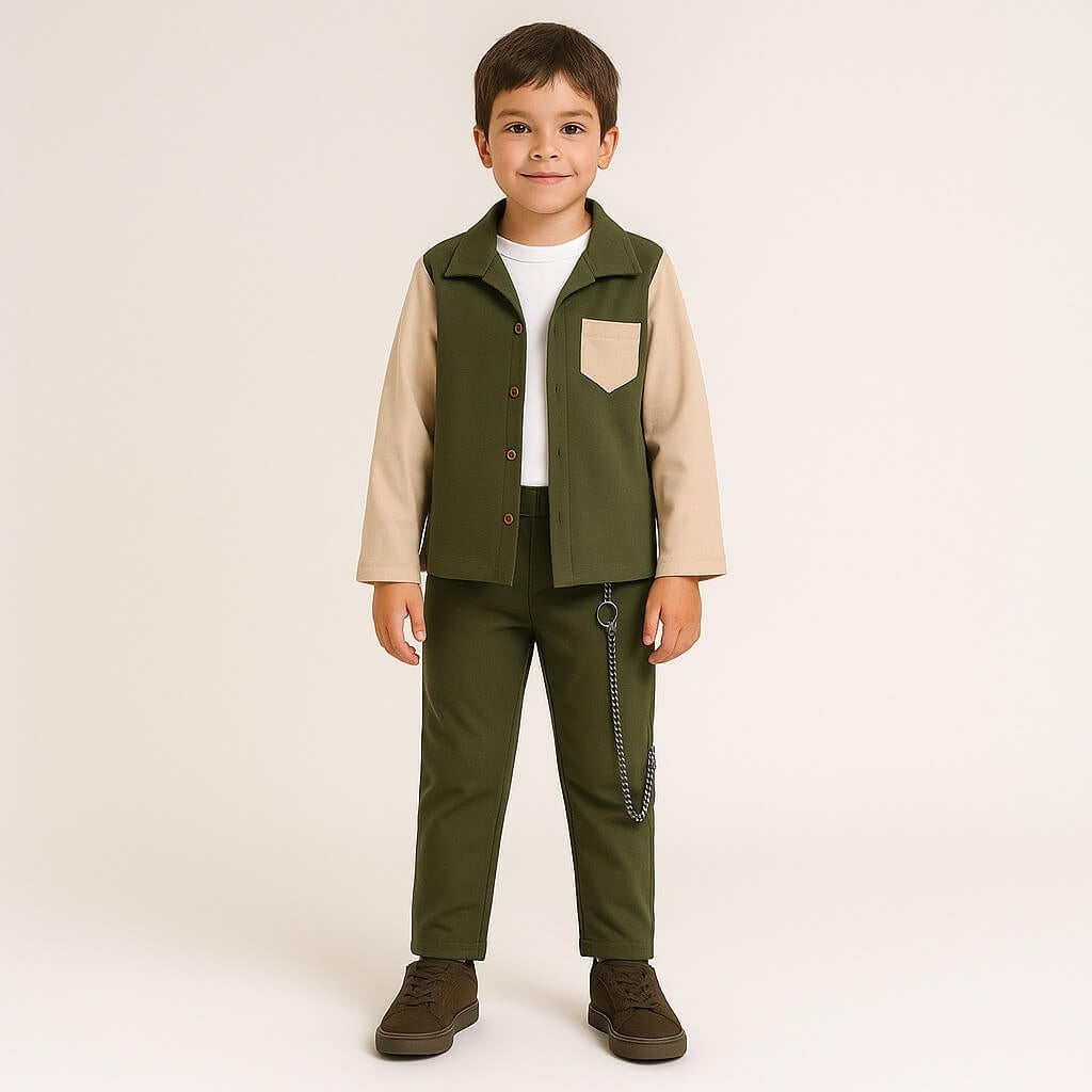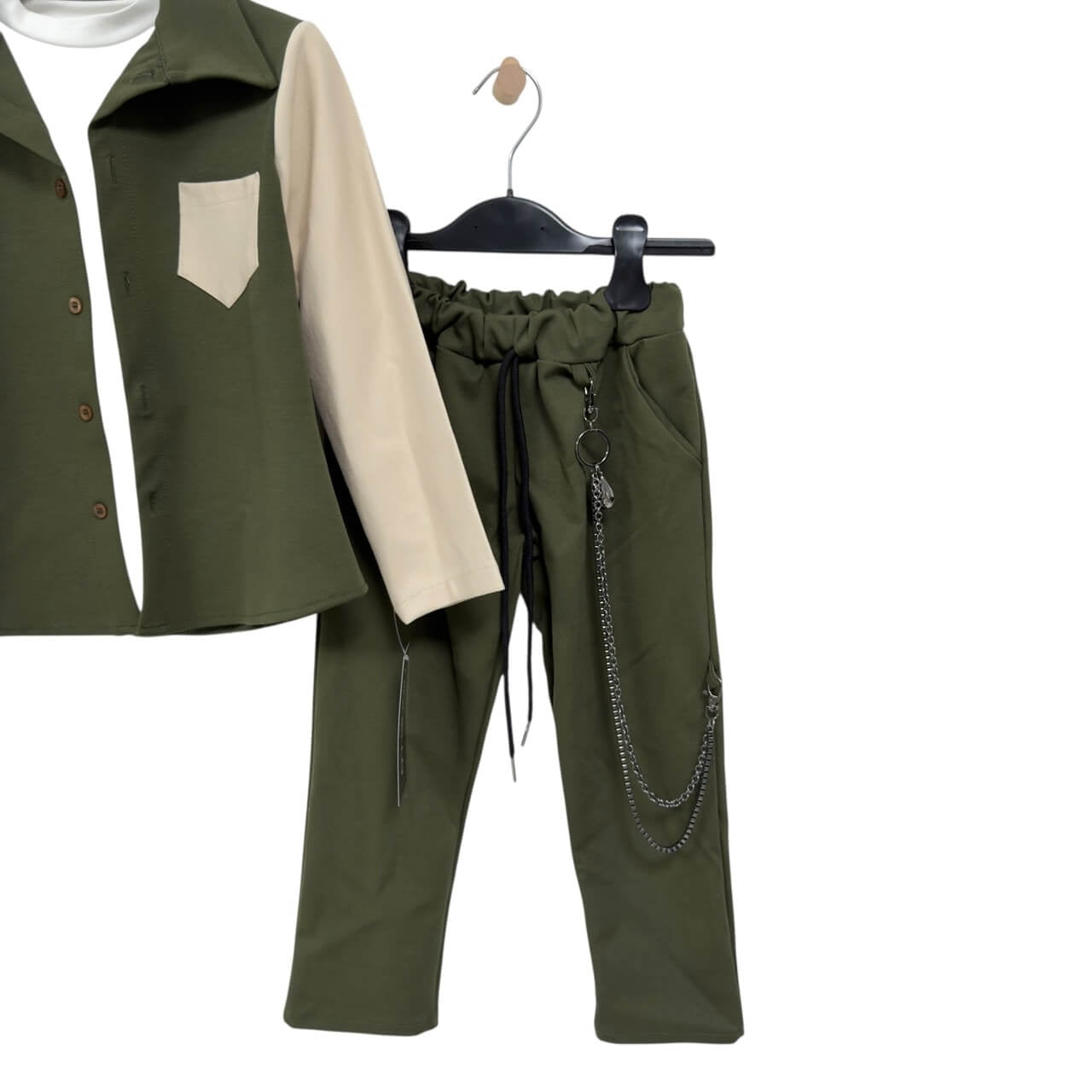 Completo composto da camicia a quadri con colletto classico e chiusura con bottoni, abbinata a una t-shirt in cotone e pantalone con catena decorativa. Il pantalone presenta elastico in vita con coulisse regolabile per il massimo comfort. Un outfit dallo stile moderno e curato nei dettagli, ideale per look casual o più ricercati, garantendo sempre qualità e comfort tipici del Made in Italy.