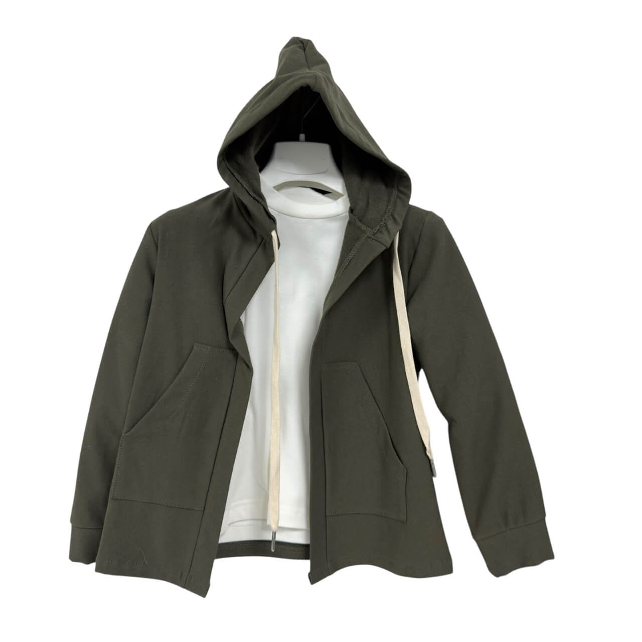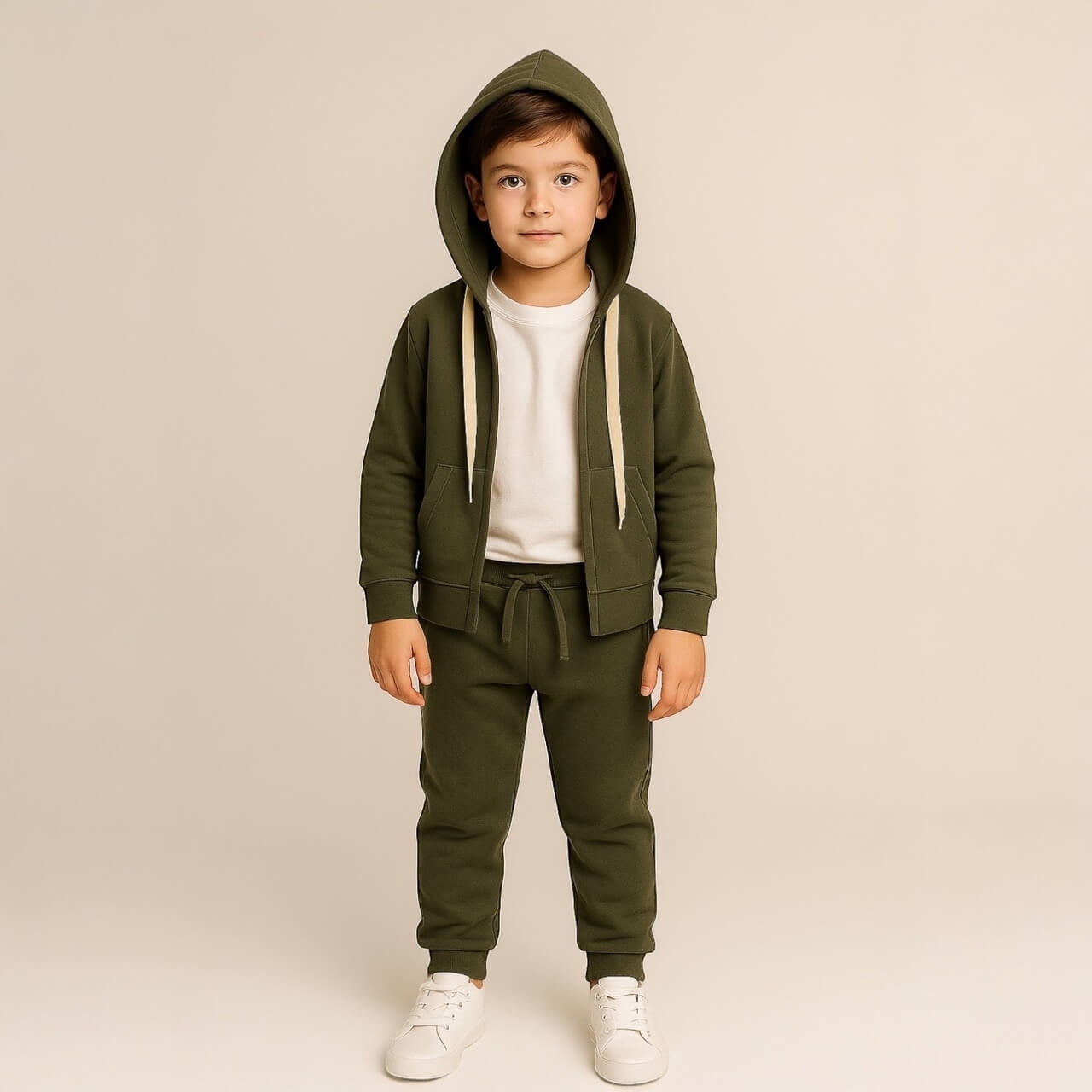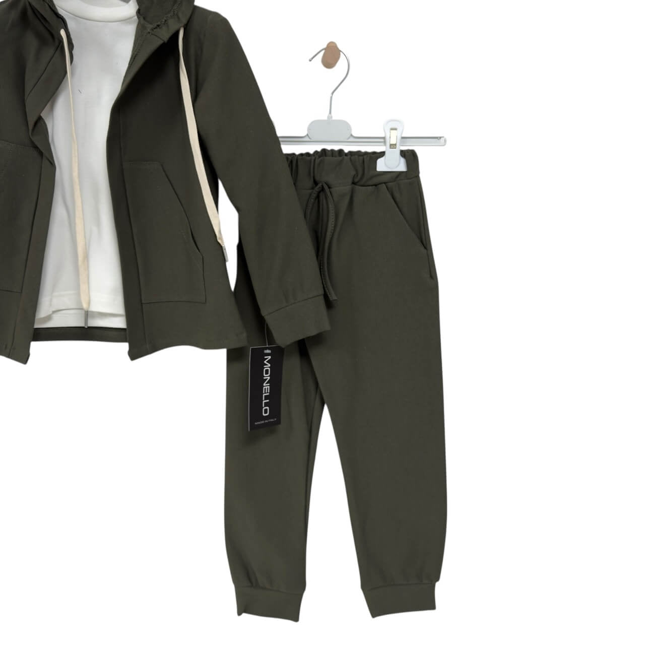 Completo composto da Felpa aperta, abbinata a una t-shirt in cotone e pantalone tuta. Il pantalone presenta elastico in vita con coulisse per il massimo comfort. Un outfit dallo stile moderno e curato nei dettagli, ideale per look casual o più ricercati, garantendo sempre qualità e comfort tipici del Made in Italy.