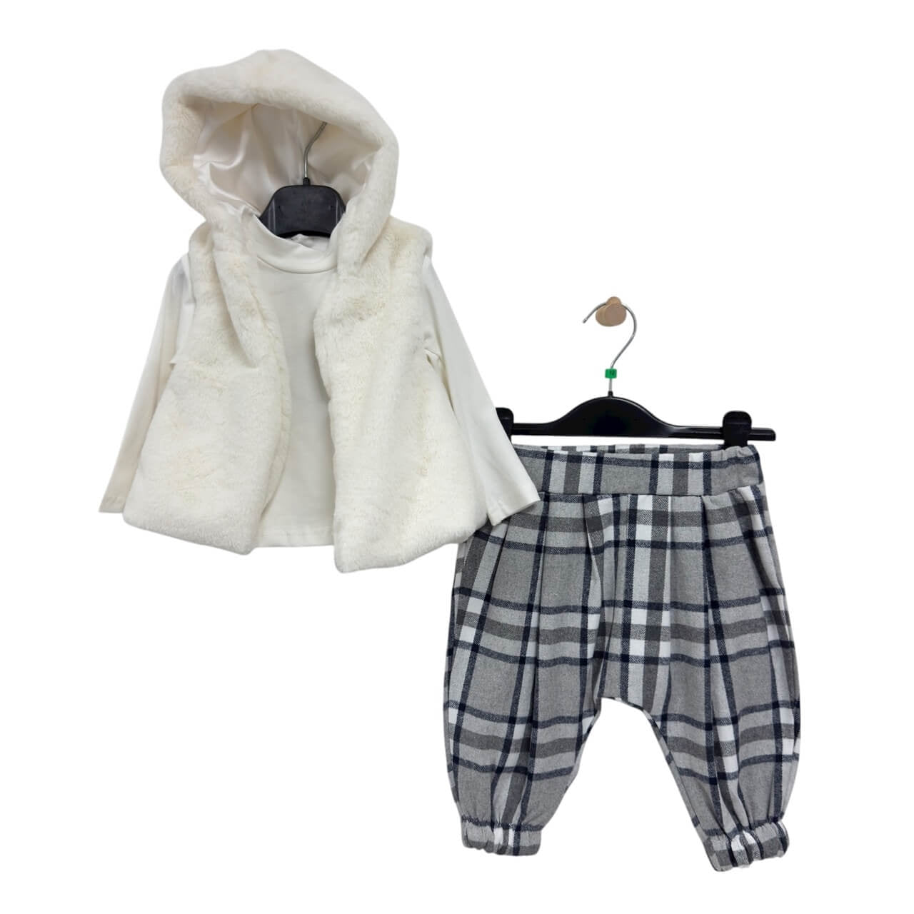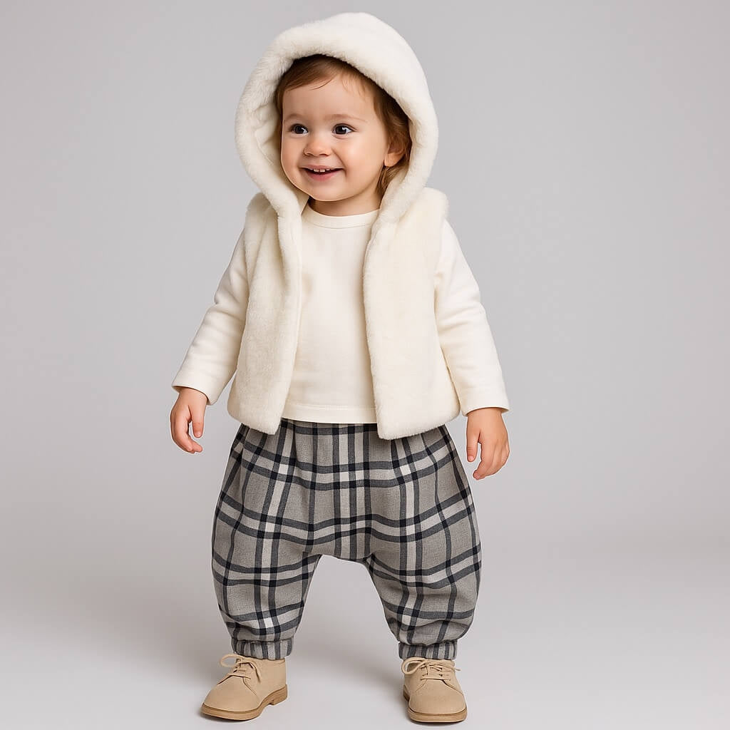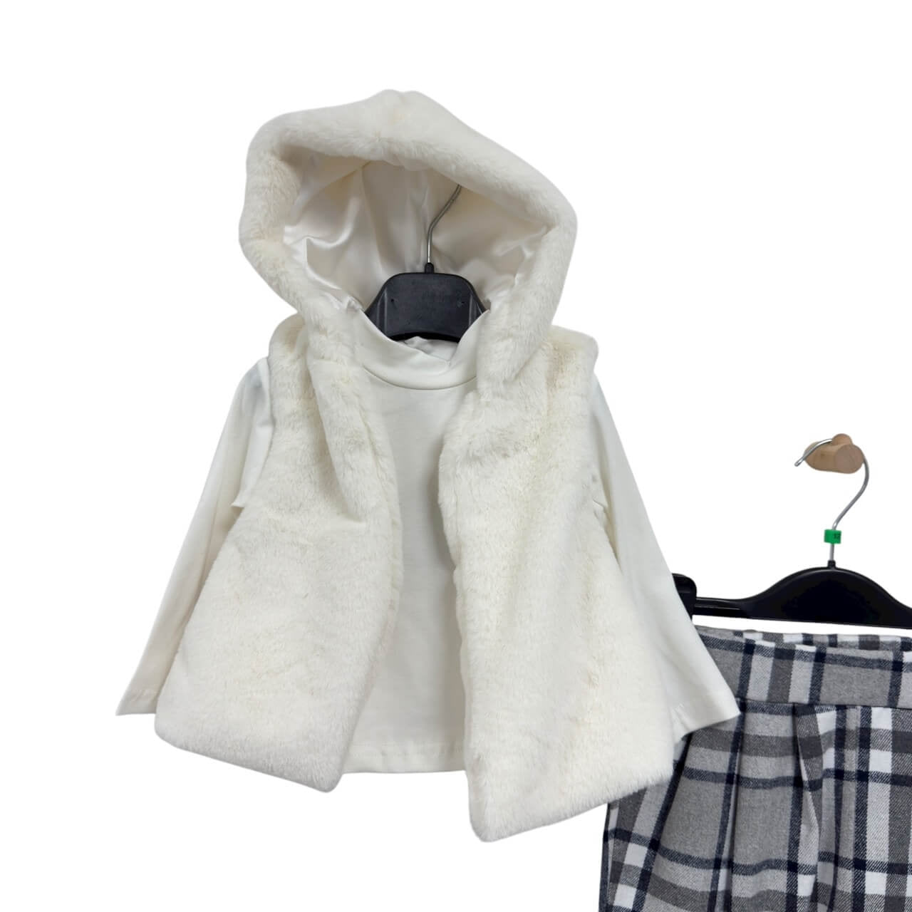 Gilet in eco-pelliccia bianca con cappuccio, soffice e avvolgente, ideale per dare un tocco elegante e proteggere dal freddo.