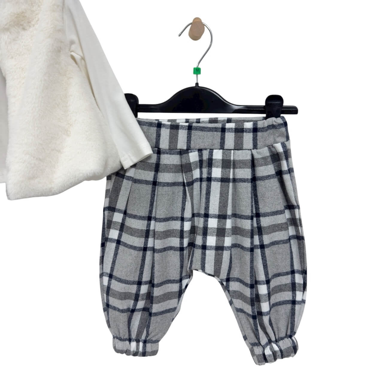 Pantaloni ampi in fantasia scozzese grigia, con elastico in vita e alle caviglie per garantire massima comodità nei movimenti.