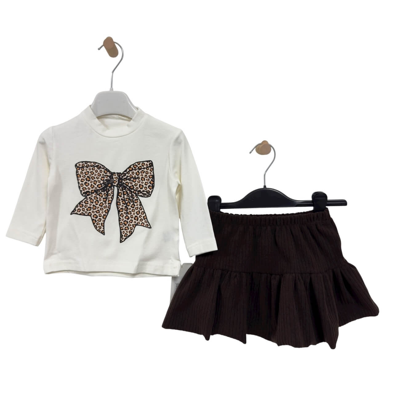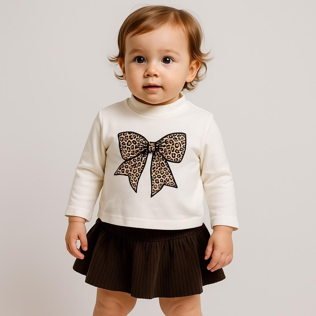 • Maglia panna a maniche lunghe con maxi fiocco stampato in fantasia animalier leopardata sul davanti, per un look moderno e vivace.