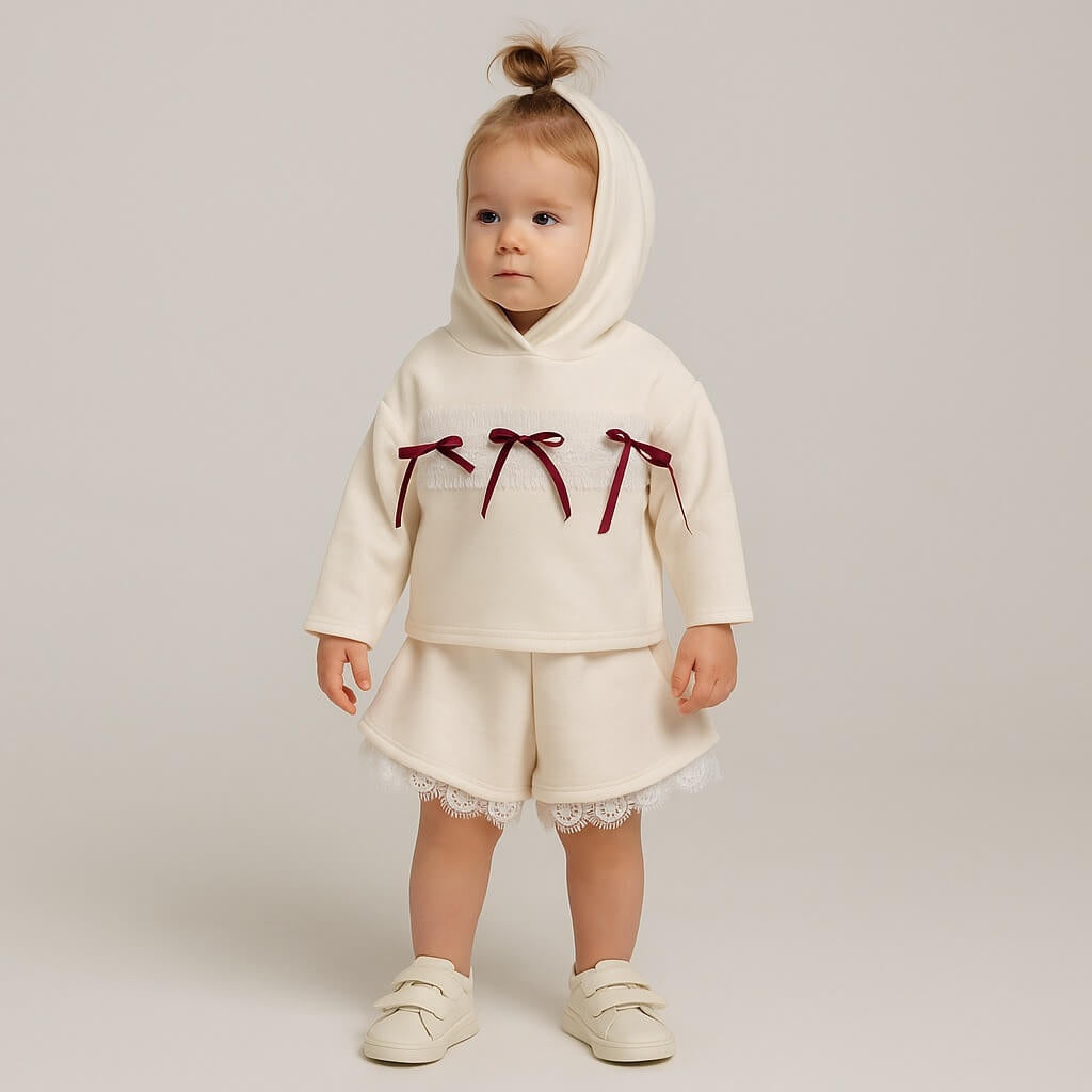 • Felpa con cappuccio decorata con inserto in pizzo e fiocchetti applicati