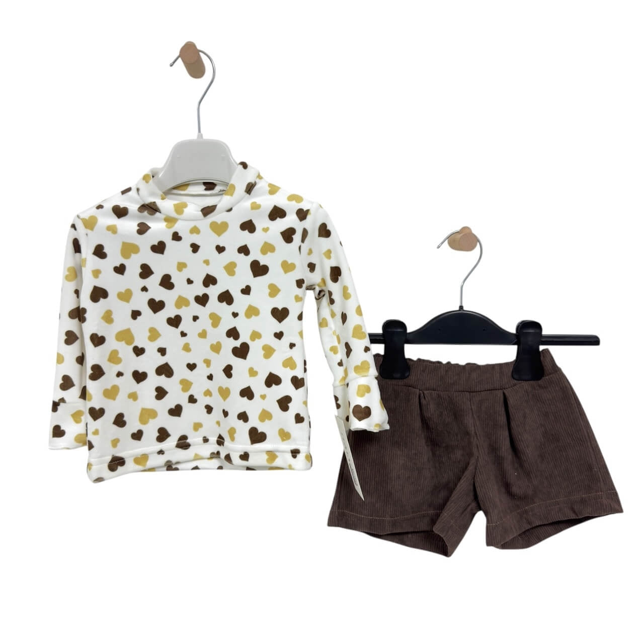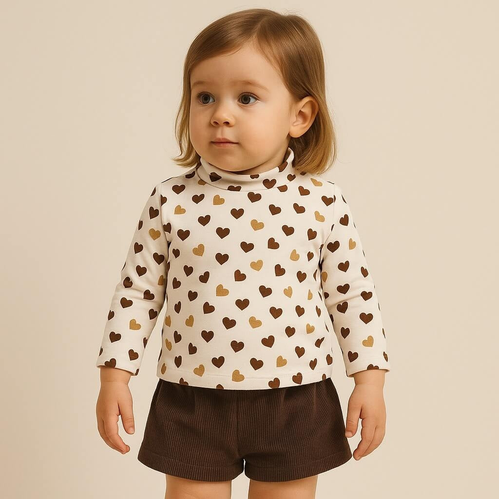 • Maglia bianca a collo alto con fantasia a cuoricini nei toni del marrone e del senape, realizzata in morbido cotone elasticizzato