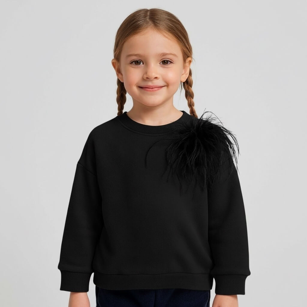 Il modello presenta girocollo classico e maniche lunghe con polsini elasticizzati, per garantire comfort e praticità. Il punto di forza del capo è il dettaglio decorativo applicato sulla spalla, che dona un tocco elegante e originale, rendendo il maglioncino unico e alla moda.