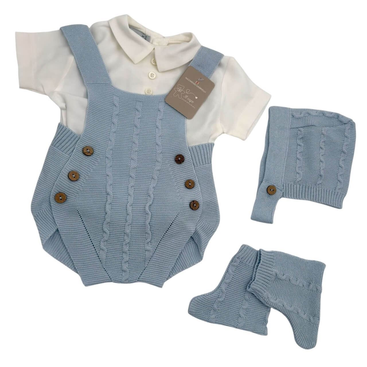 Ideale come outfit da cerimonia, regalo nascita o corredino, questo completo unisce stile, qualità e morbidezza, garantendo massima comodità al bebè.