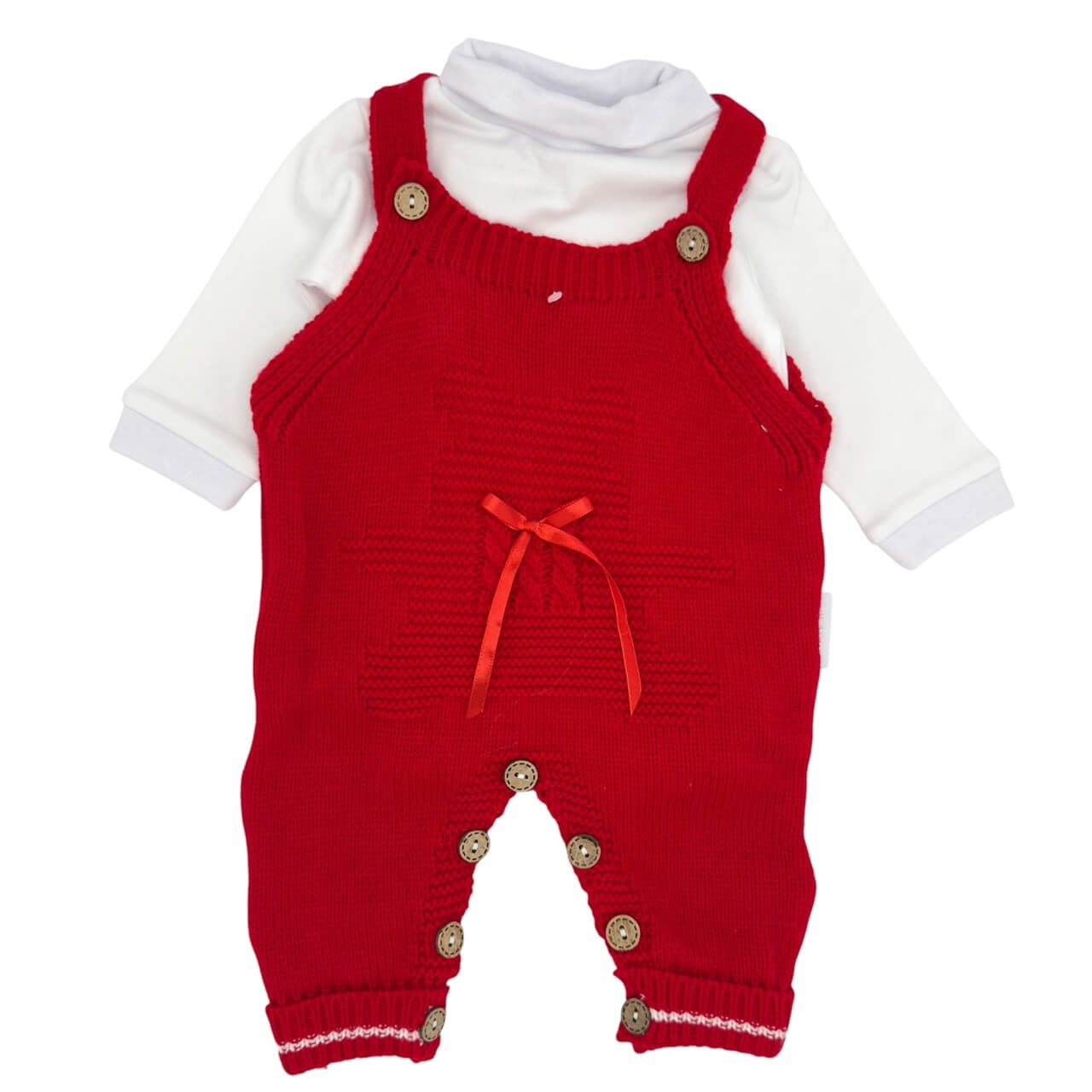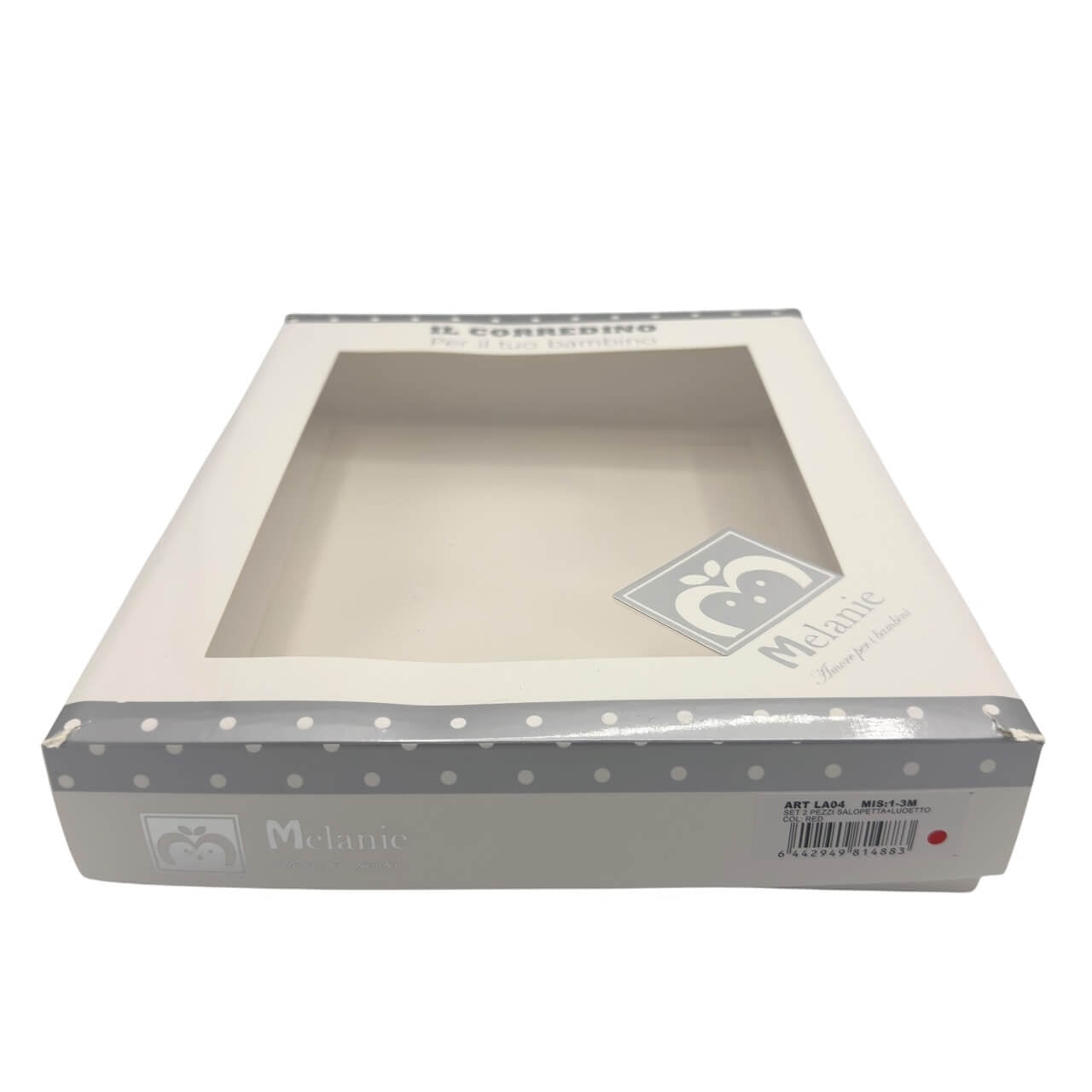 Completo neonato del marchio Melanie, disponibile nelle taglie 1-3 e 3-6 mesi. Realizzato in morbido tessuto acrilico, è composto da salopette lavorata a maglia con dettagli raffinati e bottoncini pratici, abbinata a un bodino a maniche lunghe in cotone. Confezionato in elegante scatola, è una scelta ideale per corredino o come idea regalo.