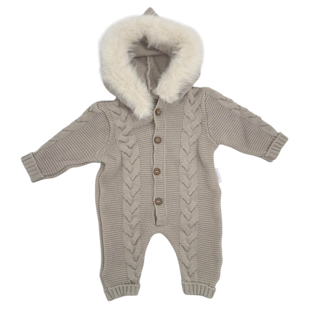 Tutone neonato firmato Melanie, realizzato in morbido tessuto acrilico lavorato a maglia con motivo treccia. Dotato di cappuccio con bordo peloso, chiusura frontale con bottoni e polsini a coste per garantire comfort e protezione. Un capo caldo e pratico, ideale per le giornate più fredde e perfetto come regalo elegante e funzionale.