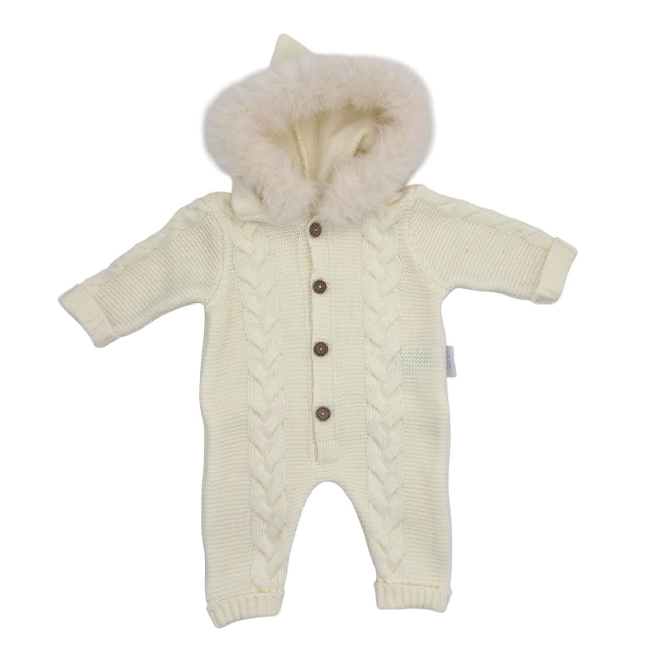 Tutone neonato firmato Melanie, realizzato in morbido tessuto acrilico lavorato a maglia con motivo treccia. Dotato di cappuccio con bordo peloso, chiusura frontale con bottoni e polsini a coste per garantire comfort e protezione. Un capo caldo e pratico, ideale per le giornate più fredde e perfetto come regalo elegante e funzionale.
