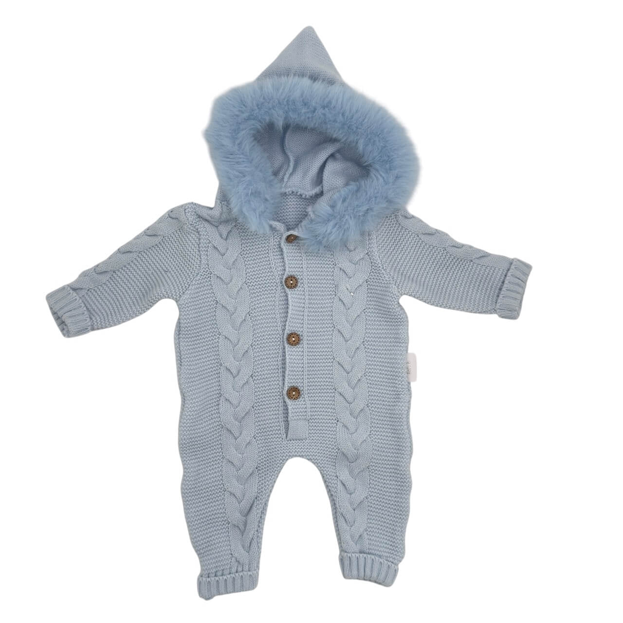 Tutone neonato firmato Melanie, realizzato in morbido tessuto acrilico lavorato a maglia con motivo treccia. Dotato di cappuccio con bordo peloso, chiusura frontale con bottoni e polsini a coste per garantire comfort e protezione. Un capo caldo e pratico, ideale per le giornate più fredde e perfetto come regalo elegante e funzionale.